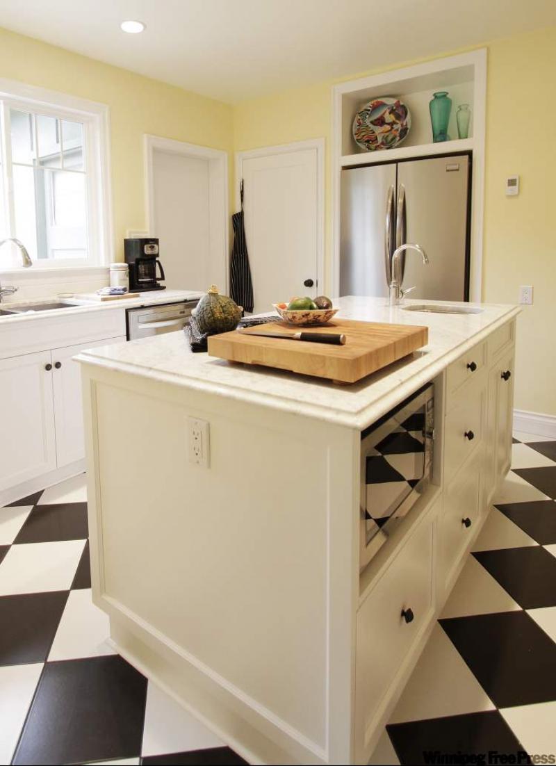 We wanted a bright space and have always liked the colour combination of white, black and yellow. We chose a black-and-white tile floor like the one we previously had, only this one would be heated, a nice feature in winter.