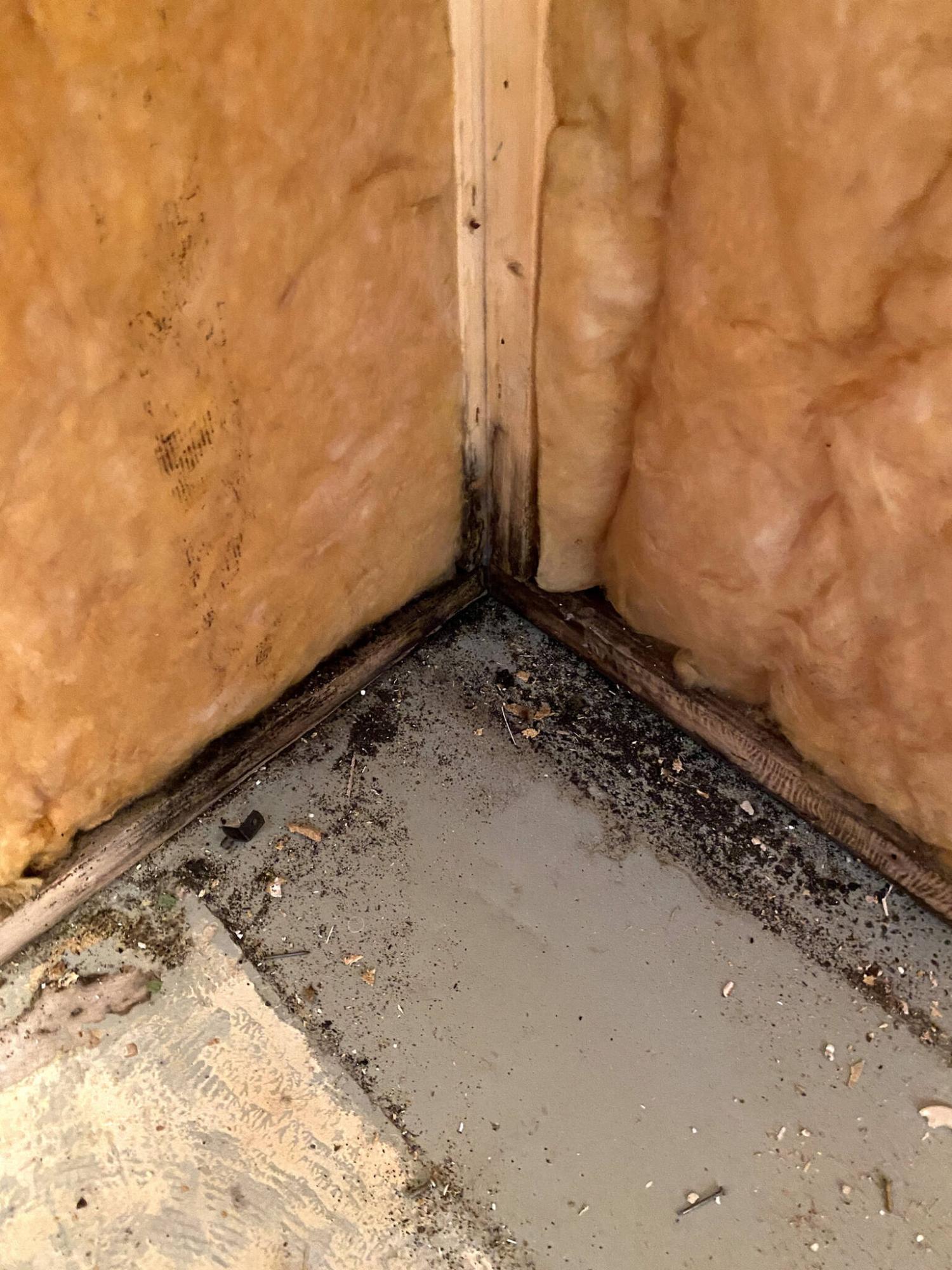 Wiring linked with twist-on connectors (left) in a finished wall cavity is not acceptable. It’s not uncommon to uncover areas of mould (right) due to moisture along basement walls.