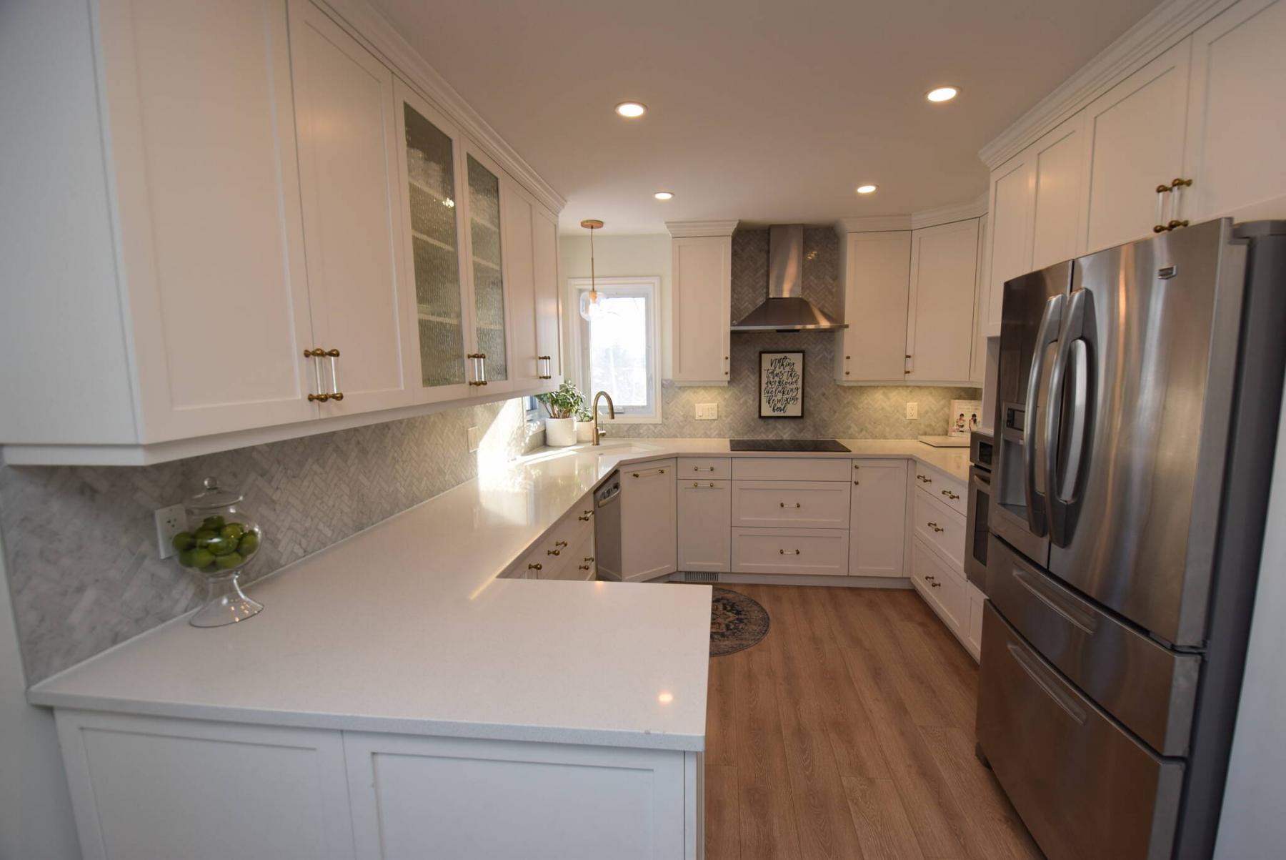 The kitchen features custom cabinets, quartz countertops, a herringbone marble backsplash and Frigidaire Gallery appliances.
