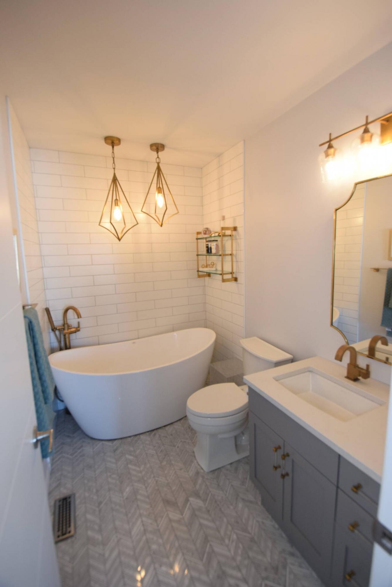 Three windows on its rear wall plus another window on its left-hand wall provide clear sightlines down to the water, and make it a bright, cheery space, she says. Theres a huge walk-in closet, and a gorgeous ensuite with a soaker tub with white tile surround and a stunning grey herringbone tile floor.