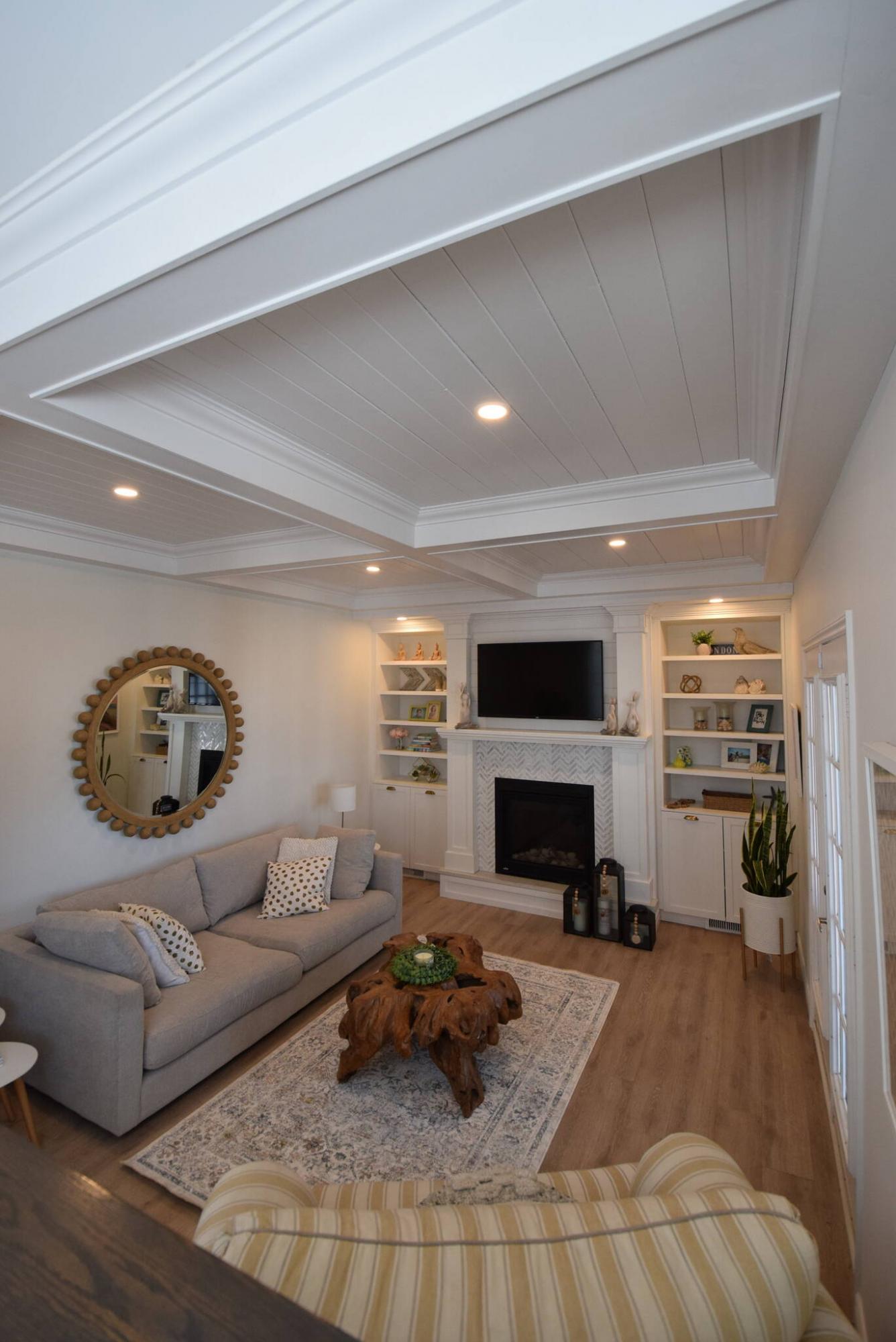 Its my favourite space in the home with its gorgeous, coffered ceiling with shiplap detailing, fireplace with herringbone marble trim and a garden door that takes you out to a three-season sunroom. It looks down the length of the lake that stretches away behind the home.