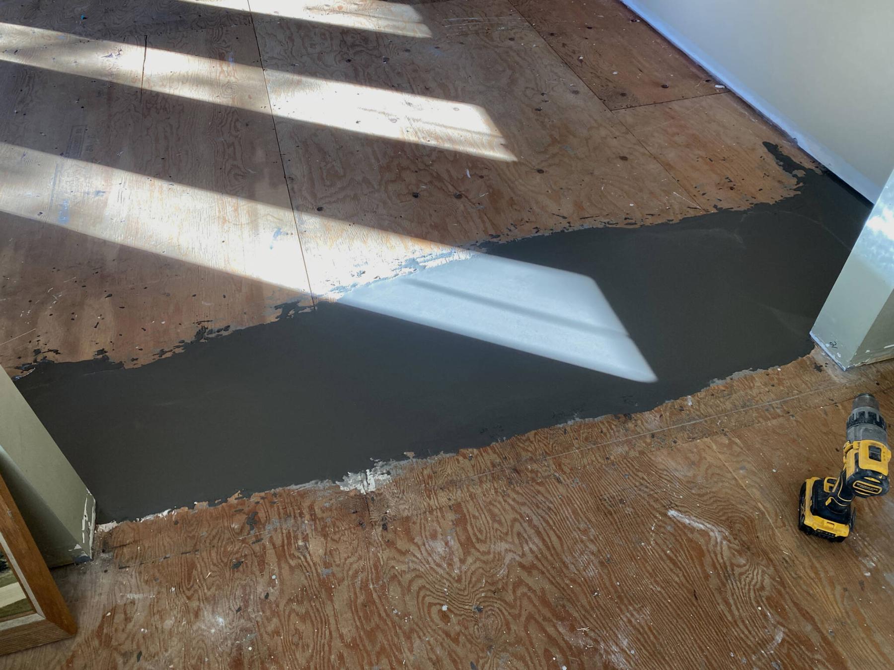 An area along the entry from the living room into the sitting room (which was an addition to the house) required application of a slight amount of leveller to achieve a lesser and nearly undetectable slope when entering the sitting room, which also allowed for easier installation of vinyl along that area.