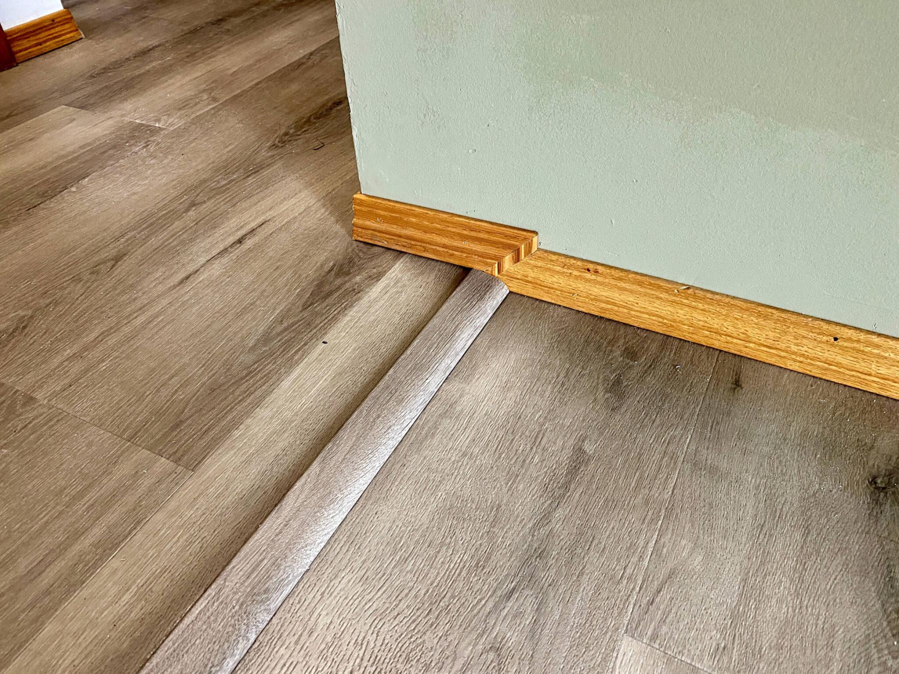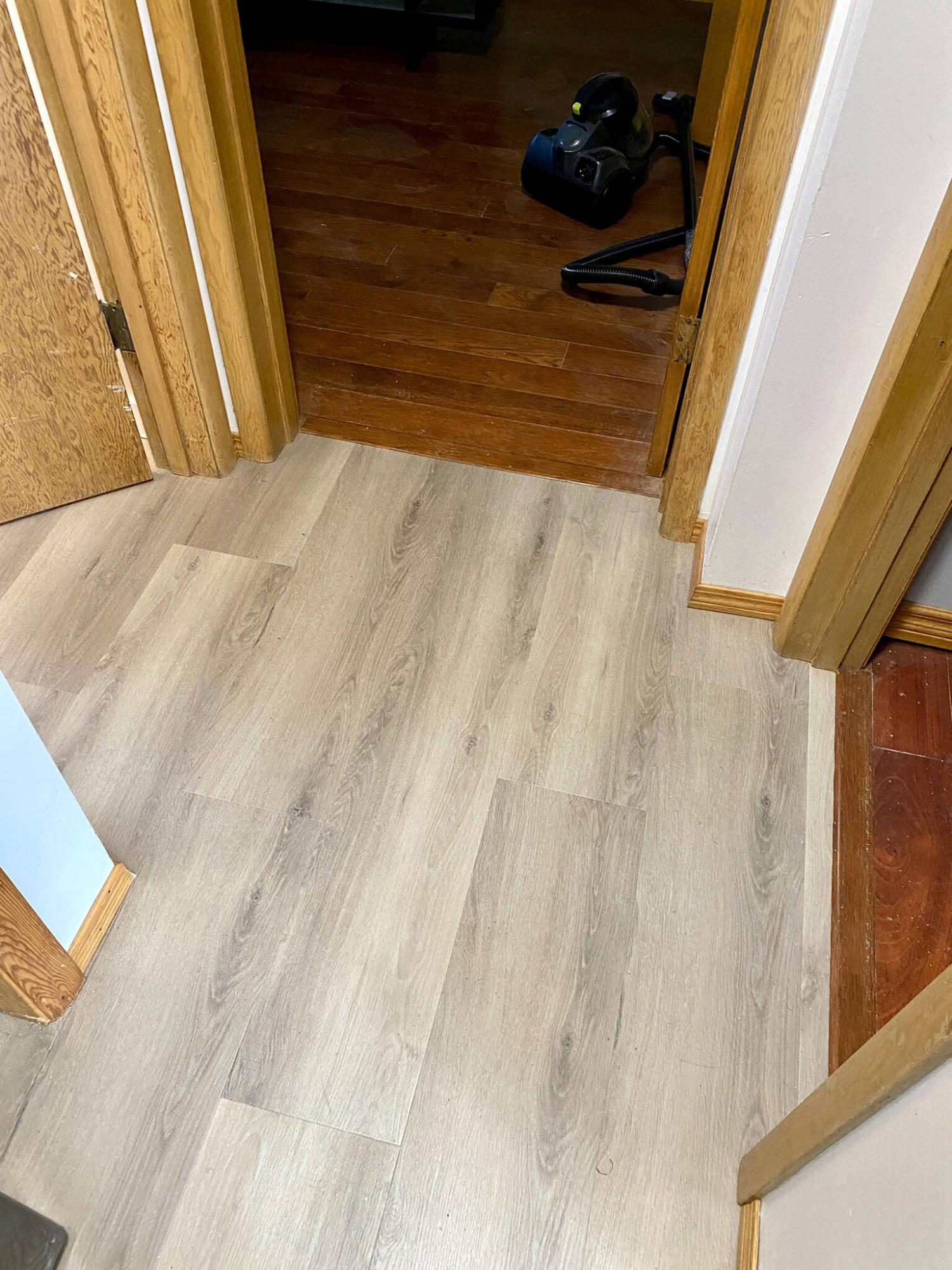 Once the vinyl installation process was completed, matching reducers were installed along both stretches of height difference. Although a consistent flooring elevation throughout the main floor of the home would have been optimal, the reducers did indeed conceal the discrepancy quite well. The baseboards were then reinstalled along the perimeters of all rooms, marking the conclusion of the vinyl-flooring installation.