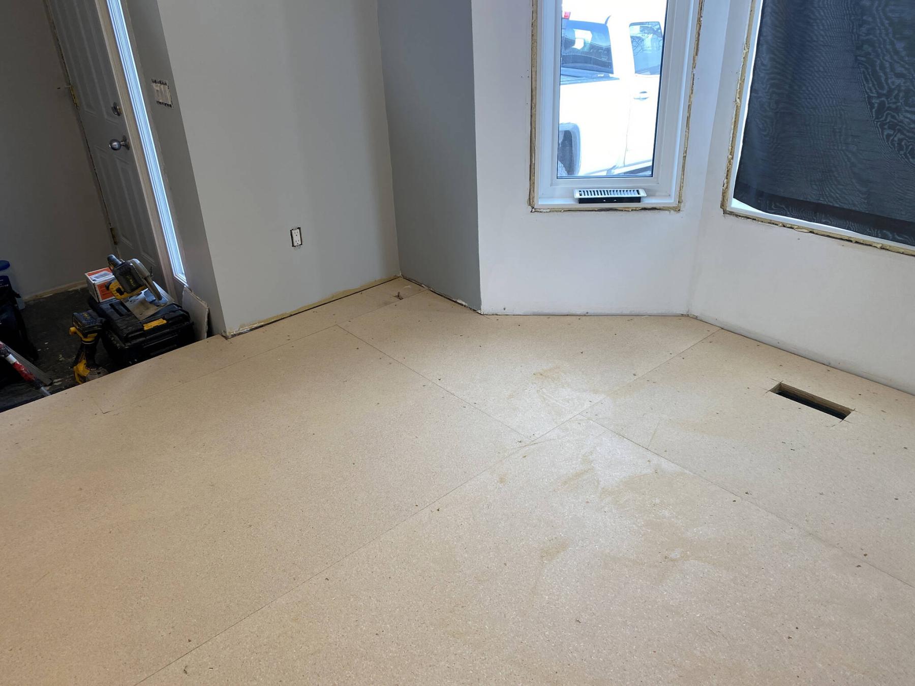 When prepping a subfloor for the installation of new flooring, the best-case scenario simply involves the removal of the old flooring. In most cases however, further steps are required to ensure the integrity and rigidity upon which the new flooring will be laid. At a current jobsite, the removal of the old linoleum in the kitchen and wood laminate throughout the living room presented an elevation discrepancy. To meet the already built-up kitchen subfloor, five-sixteenth pro-board would rectify the issue, or so I thought.