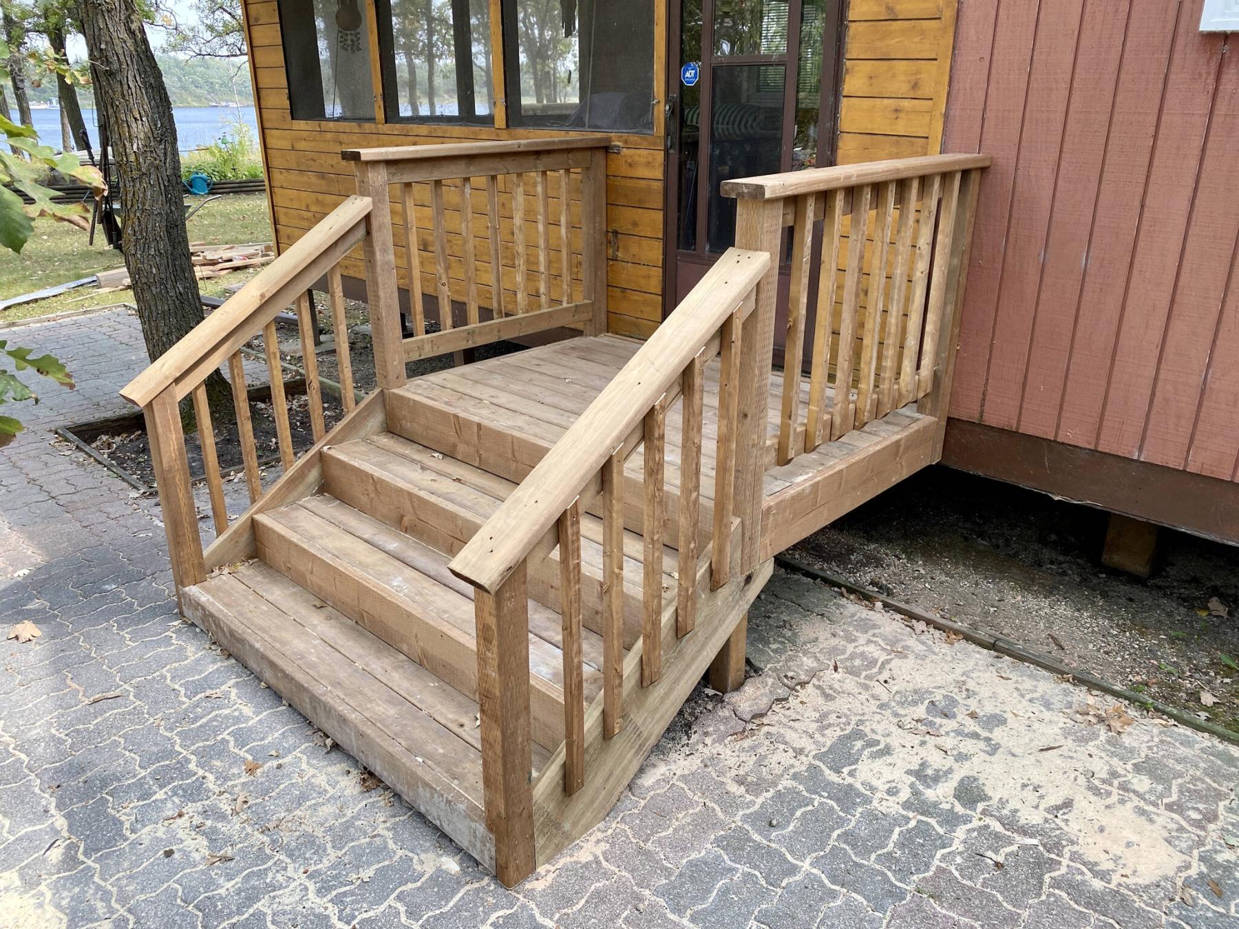 Quoting a singled-tiered deck can be very straightforward, once the design and dimensions are known, provided the entire deck is to be built using treated lumber. As such, measurements for both the rear deck and front steps were taken before I left the jobsite after initial tasks of re-levelling the cottage and installing the windows had been achieved over a two-day period. Within the next few days, the quotes for both intended upgrades were promptly forwarded to the cottage-owner.
