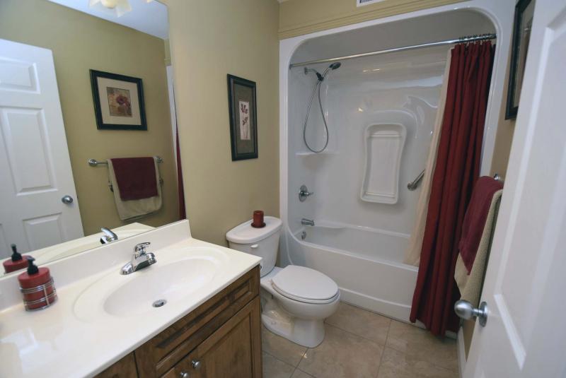 First — on the right-hand wall — there’s the storage room, followed by a four-piece main bath with maple vanity, tile floor and vinyl soaker tub/shower combo. The two bedrooms are tucked neatly away to the rear in their own private wing.