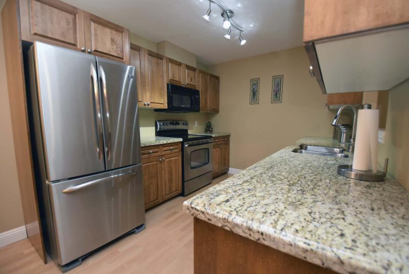 Flooring (throughout the main living area) is a high-grade natural maple laminate (in excellent condition), while the kitchen features granite countertops, cinnamon maple cabinets, track lighting and stainless steel appliances.