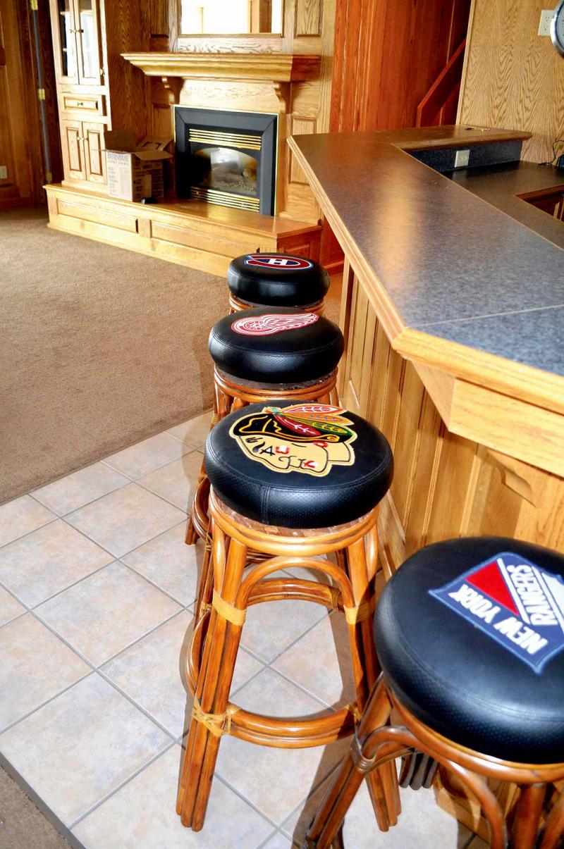 A wet bar built of oak includes stools upholstered with the logos of NHL teams; a round coffee table resembling a puck has the logos of the six original NHL squads on its top.