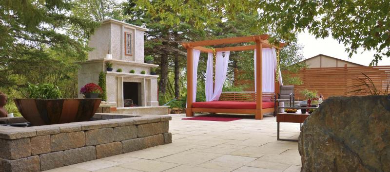 Privacy and a comfortable space is achieved in this landscape complete with an outdoor daybed next to a warm fire.