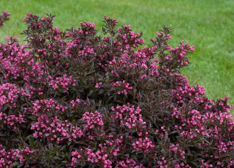 Spilled Wine Weigela is a compact, low-growing shrub that is wider (60 cm) than it is tall. It sports deep-purple foliage and bright-pink flowers that bloom in spring.