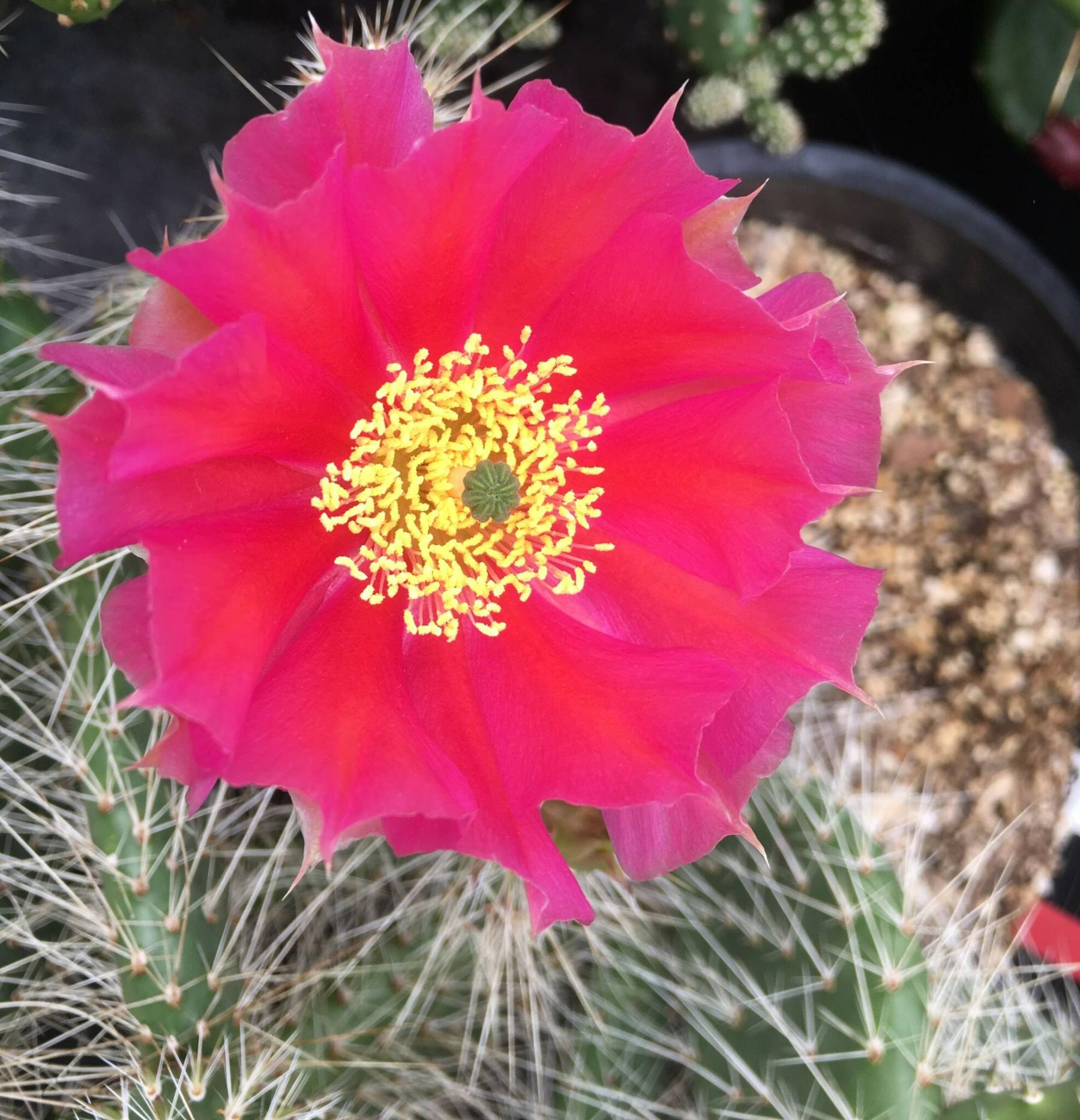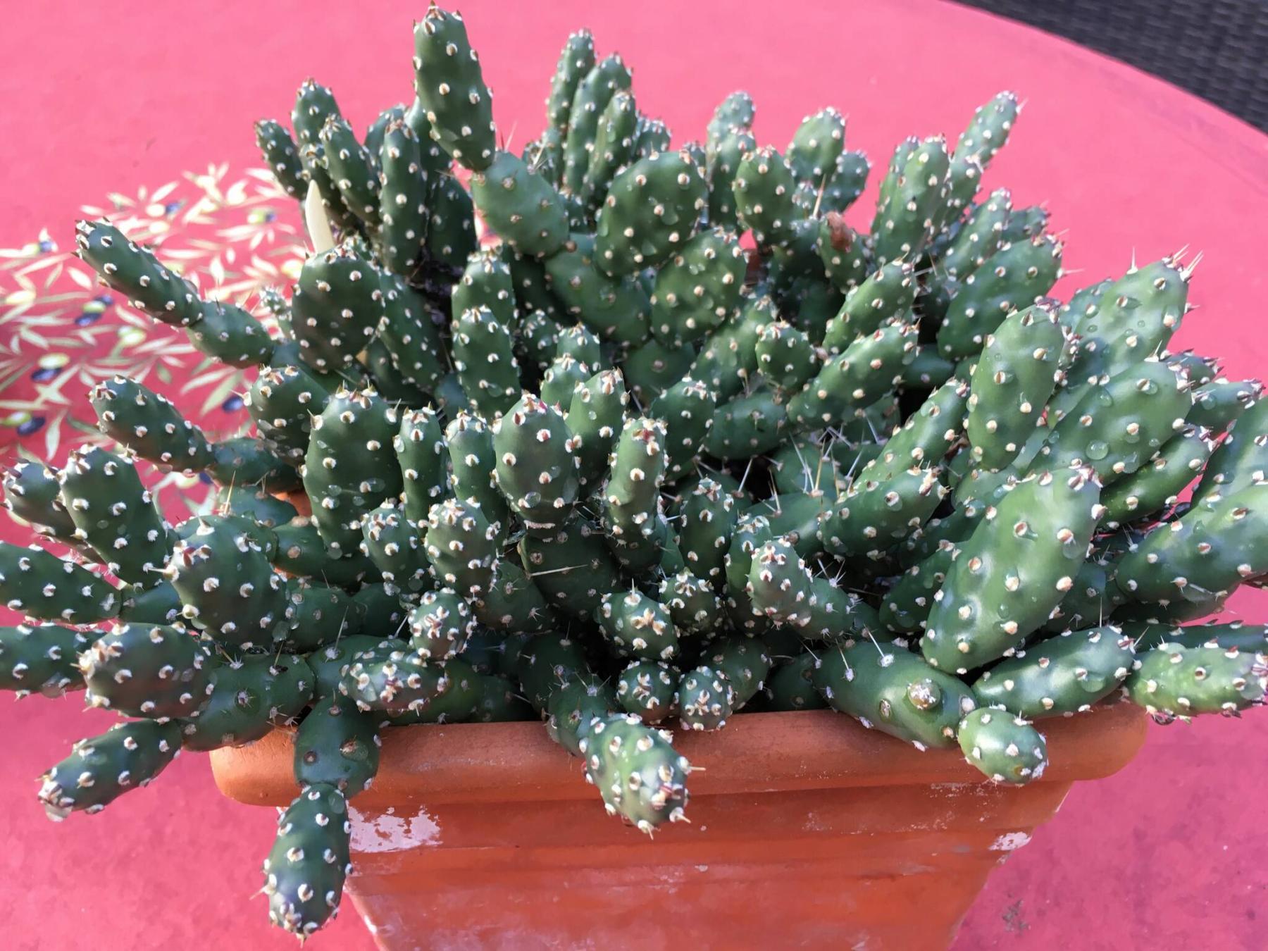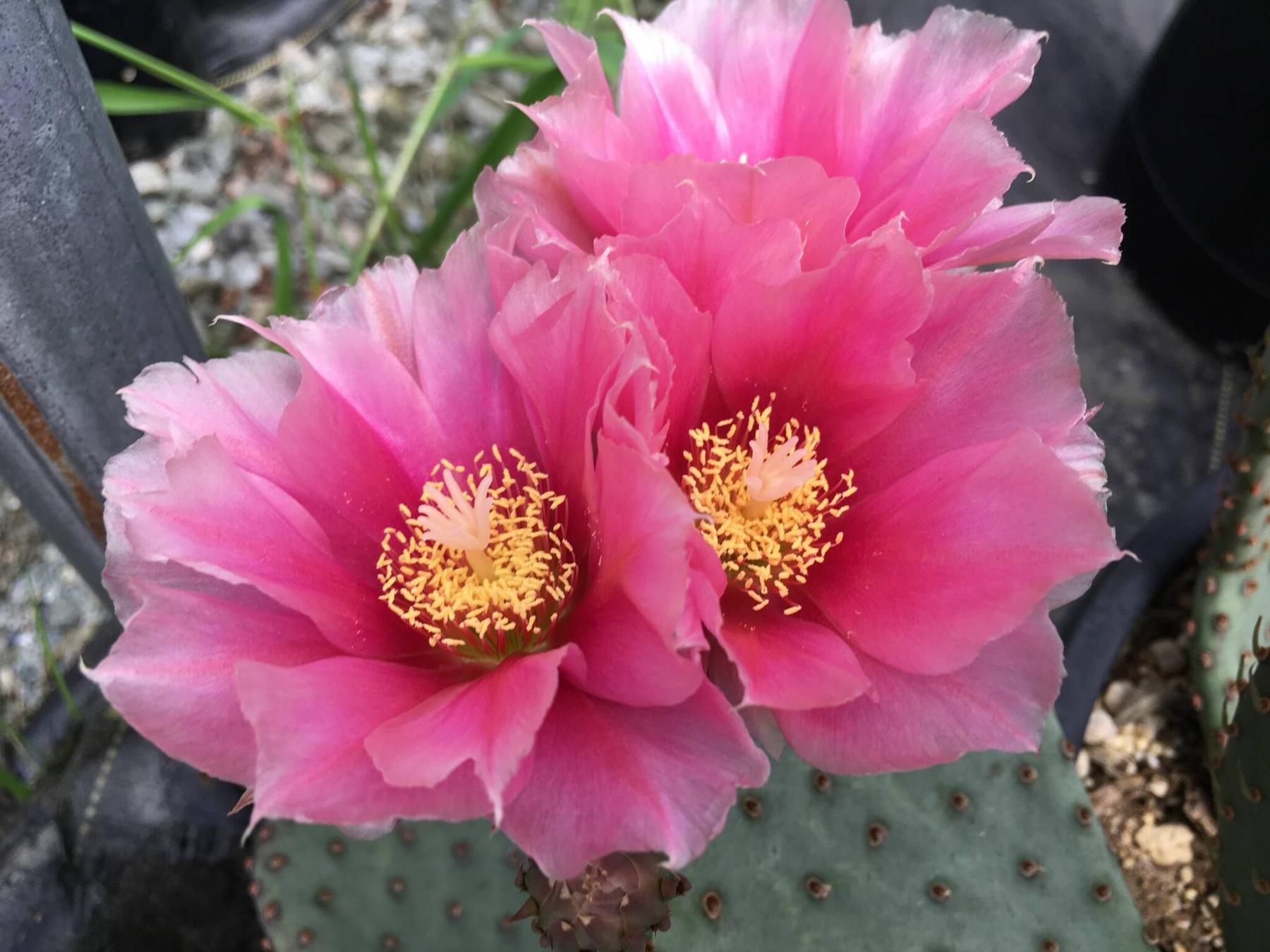 Opuntia Browse Pink, aka plains prickly pear, is a hardy cactus with double ruffled hot pink flowers.