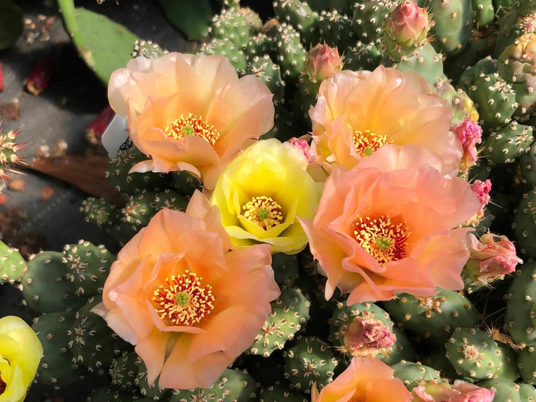 Opuntia Alberta Sunset is a Zone 3 prickly pear with peachy keen flowers and nearly spineless pads.