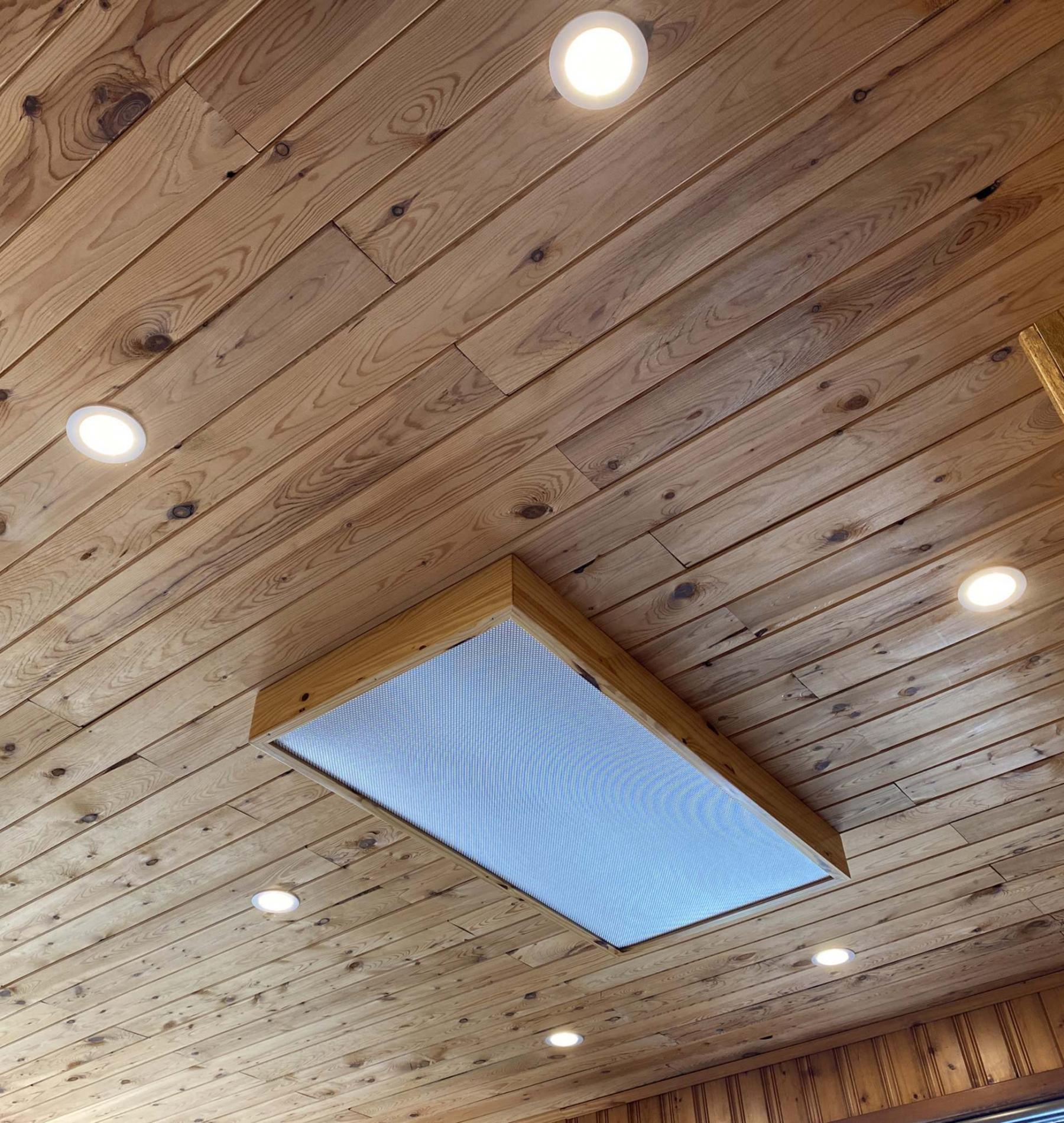 One by one, 14/2 wire was fished from one hole to the next in series using a six-foot metal dowel, that can be shaped to negotiate the spacing of the trusses behind the ceiling surface. Once all holes were fished, the final feed from the switched was fished to the closest hole. With that step behind me, the wiring process was straight forward, all-be-it time-consuming. One by one, the junction boxes for each LED slim were tied-in to the next light location. At the final LED location, the interrupt feed was then tied to that closest light junction box. The boxes were all placed withing the ceiling cavity through their respective holes, and the slim LEDs were connected to the wire feed from the junction boxes. A quick flip of the switch revealed that all eight lights became active, allowing the final placement of all eight LED lights, recessed into the holes which had been strategically drilled through the decorative pine ceiling boards. The dimmer would now allow my clients to adjust the lighting to suit their mood.