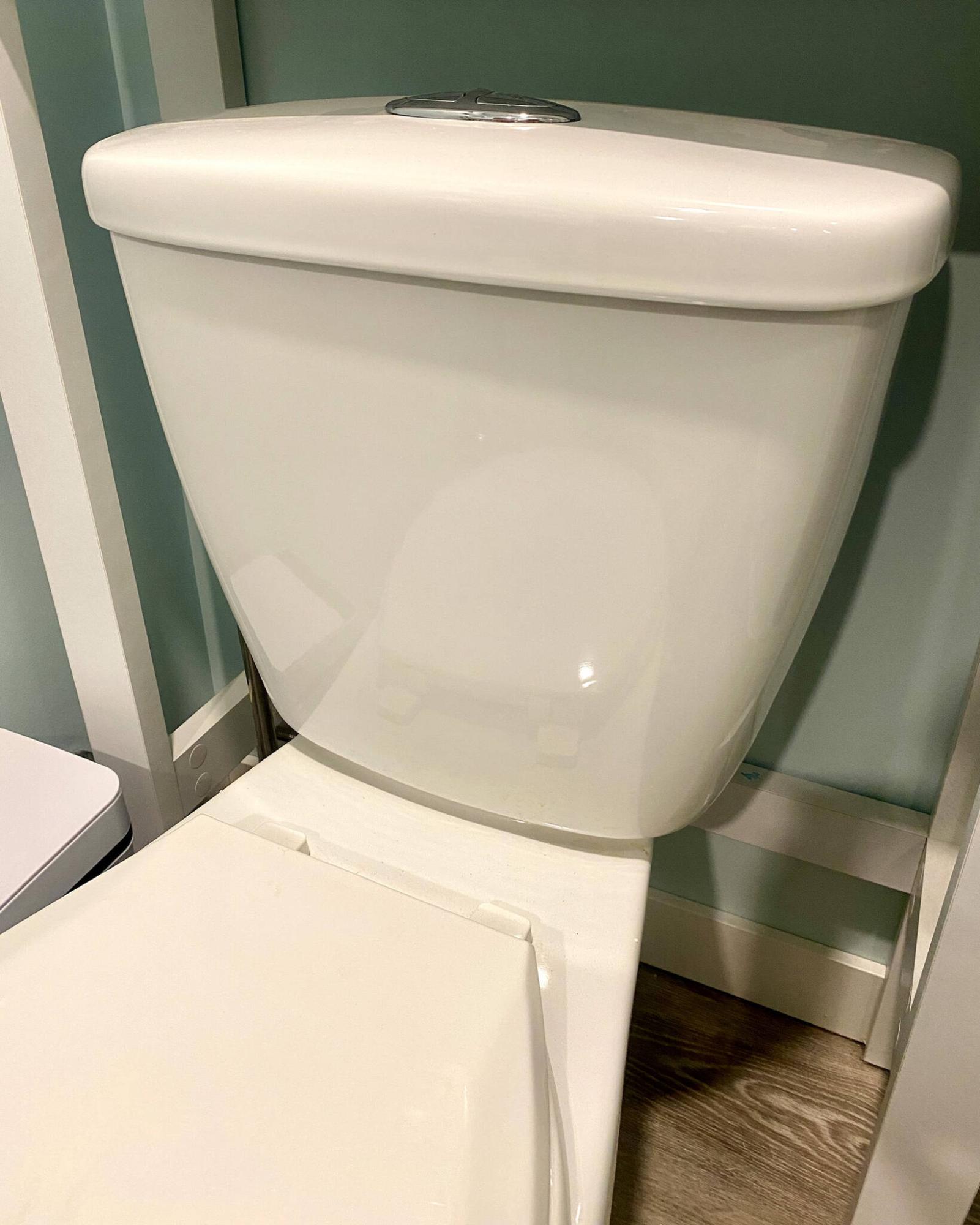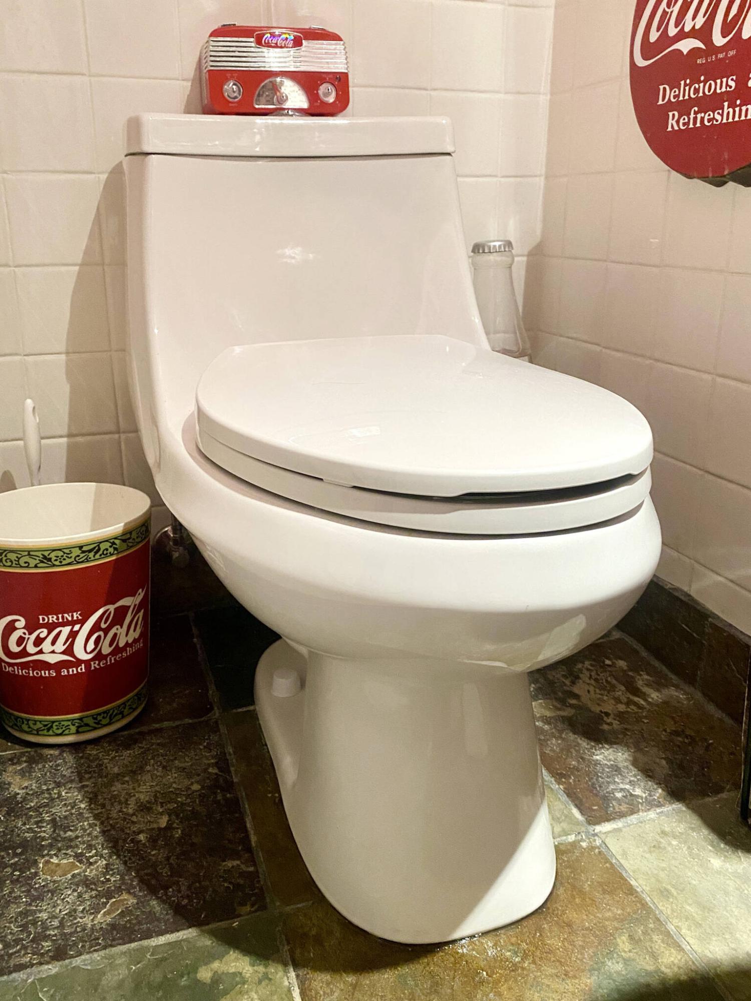 Later that day, a sleek looking one-piece toilet was picked up and — once the old toilet was removed — set atop the new wax ring and secured to the floor. Then the water feed mesh hose was attached to the toilet valve and given a test run. A few quick flushes indicated that the toilet was ready for use — the Coca-Cola Bathroom was back in action!