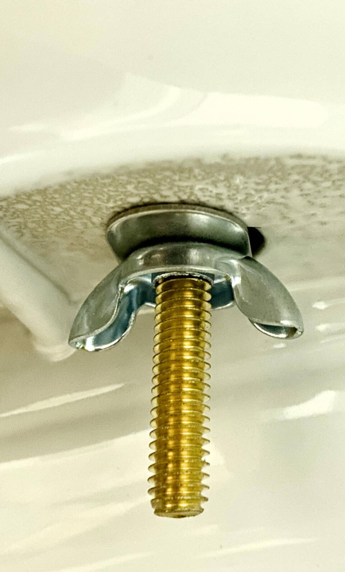 One of two brass bolts used to secure the tank to the base of a two-piece toilet.