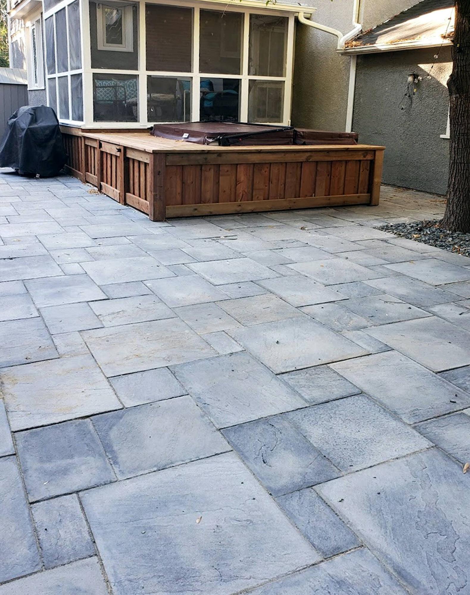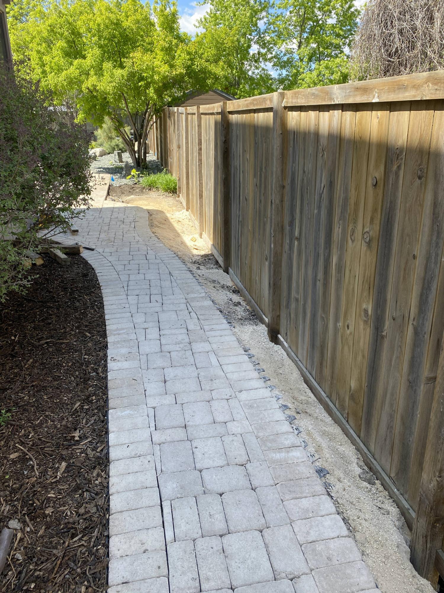 The landscaping tasks involved several locations of set patio blocks, a walkway that leads from the front driveway to the backyard, and numerous shrubs and greenery strewn within an array of river rock fill that would negate any backyard lawn.