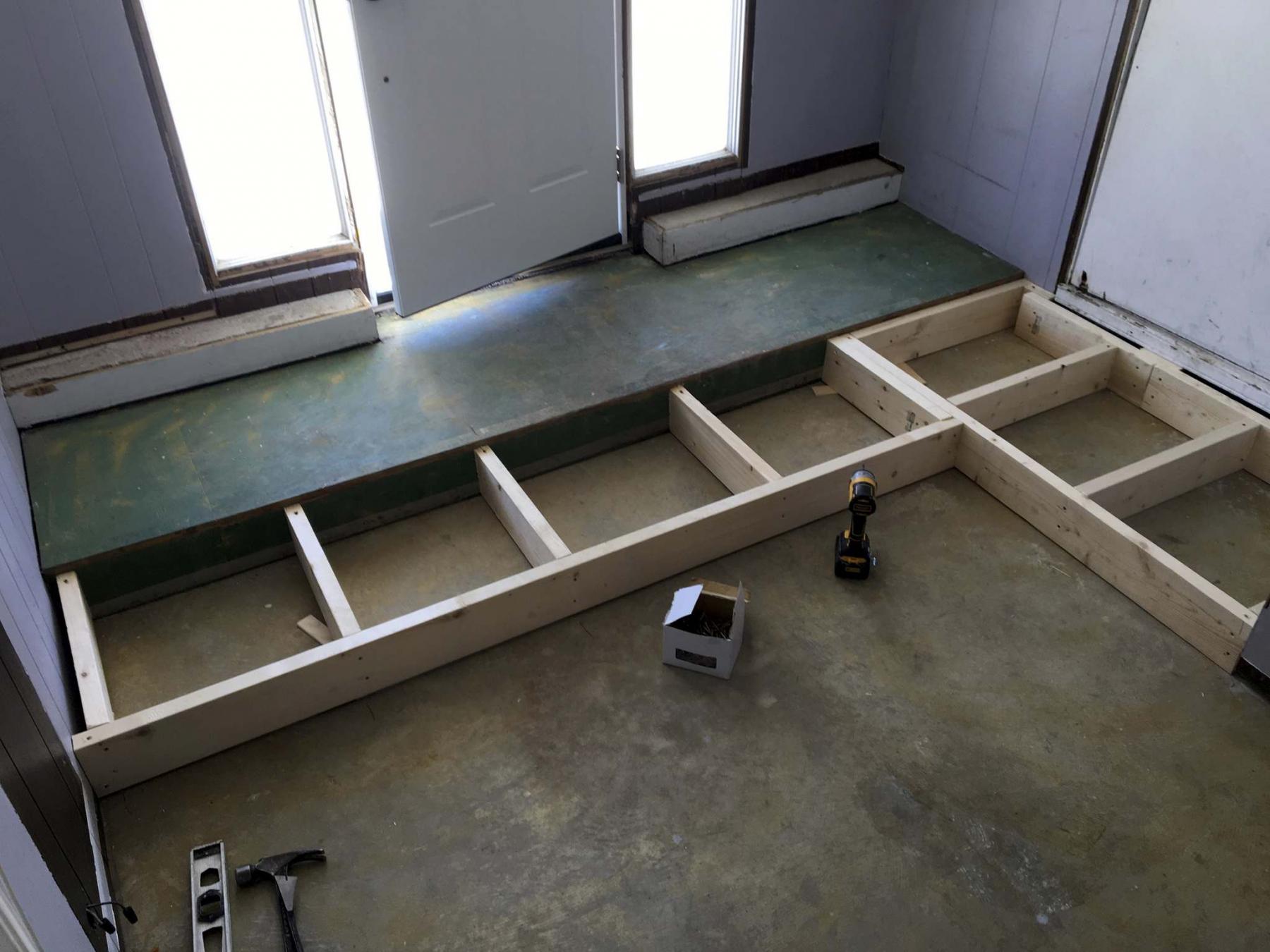 To meet the elevation of the existing step, two-by-six boards were ripped slightly in accordance to the slope of the lower-level floor, and shimmed where necessary to ensure rigidity. The new portion of the landing was framed three-quarter inches lower than the top of the existing step. With the new plywood affixed to the top of the new landing framework, both old step and new merged to a flush elevation. The vinyl laminate chosen for the area was first installed along the upper tier, and continued along the lower tier and into the closet. Once the fascia of the upper step was finished with laminate, the 90-degree edge was fitted with an aluminum nosing. Other custom elements below each window were also finished with laminate and nosing. All inner seams were then caulked to prevent any water breach during the wet seasons. This now-functional area was ready for new paint and baseboards.