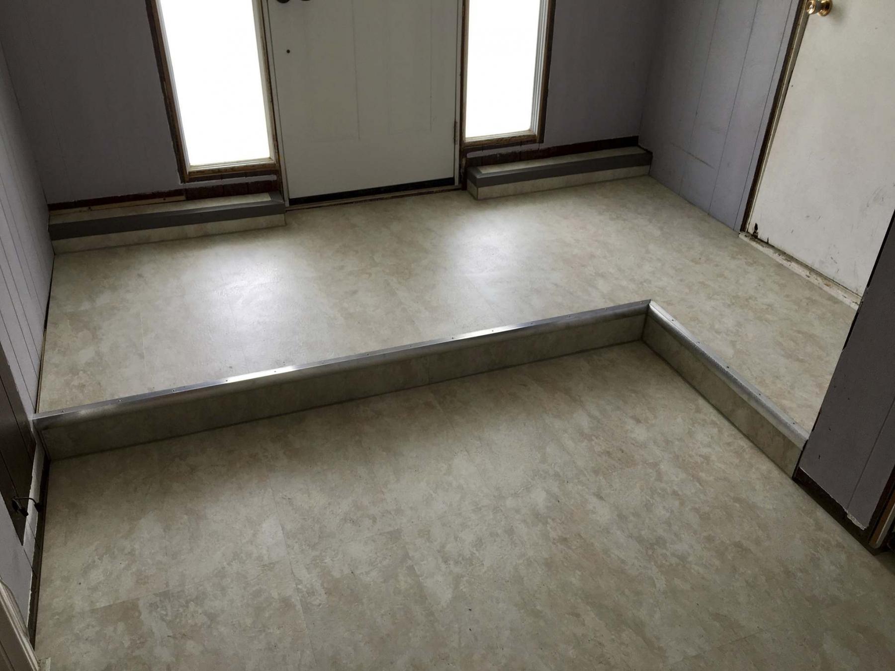 New laminate flooring and aluminum nosing finish the L-shaped upper step of the foyer.