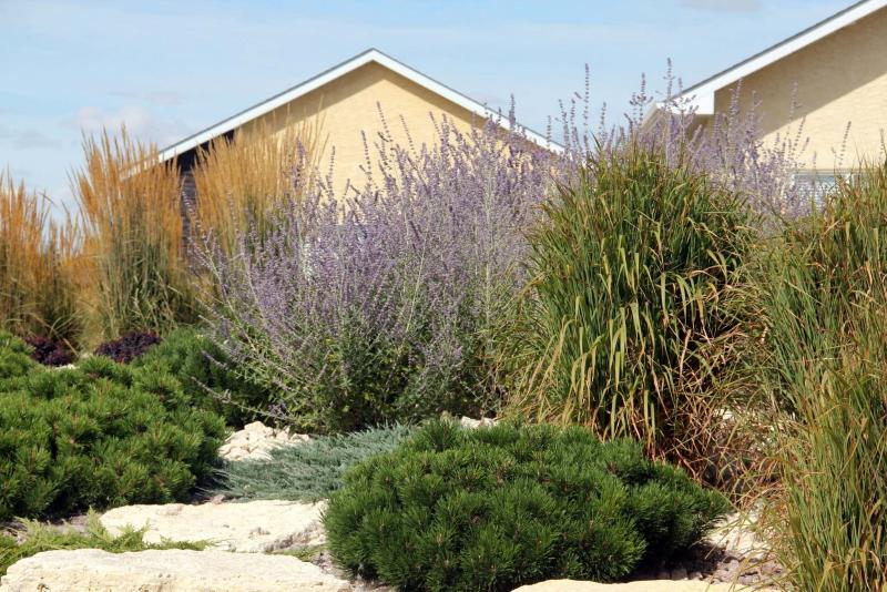 This xeriscape in Winnipeg is ready for the heat. Plants include drought-tolerant grasses, Mugo pine and Russian Sage.