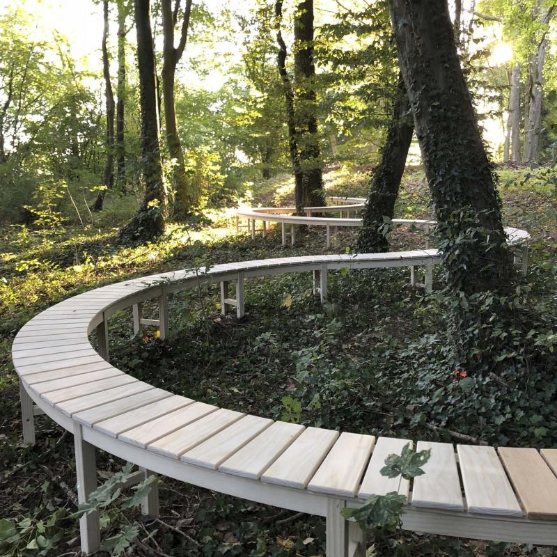 The main structure, Fisher Tomlin says, is a single seat 33 metres long which sits gently upon the ground within a quiet part of the woodland at Thiepval. The bench, crafted from Welsh oak and Portland stone, winds its way around existing trees such as European Beech and oak growing in the woodland. New plantings will include the seeding of primroses — primarily Primula vulgaris but also Primula veris, commonly called cowslip.
