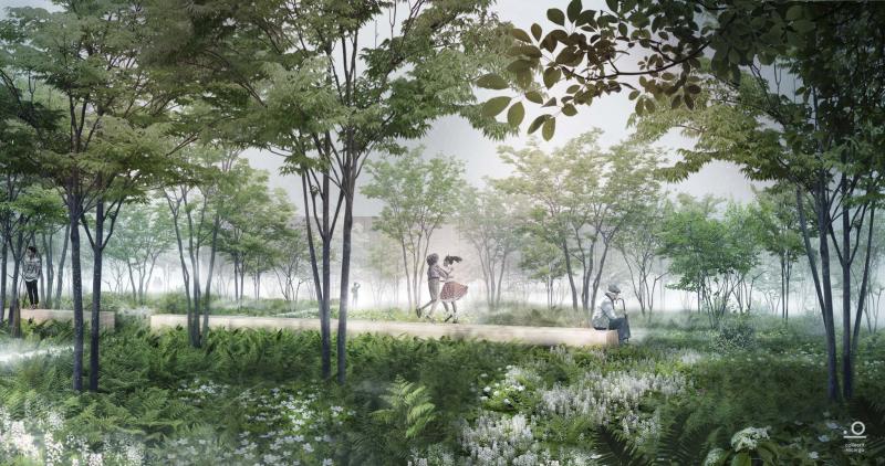 The Garden of the Third Train was designed by a Franco-German team of three designers. Located in the Compiegne forest where the armistice was signed Nov. 11, 1918, in a railway carriage, the designers have landscaped the pathway which leads to the clearing. A long, low bench set with dozens of mirrors illuminates the space with reflections of the sky and foliage in the image of a third train, the train of peace.