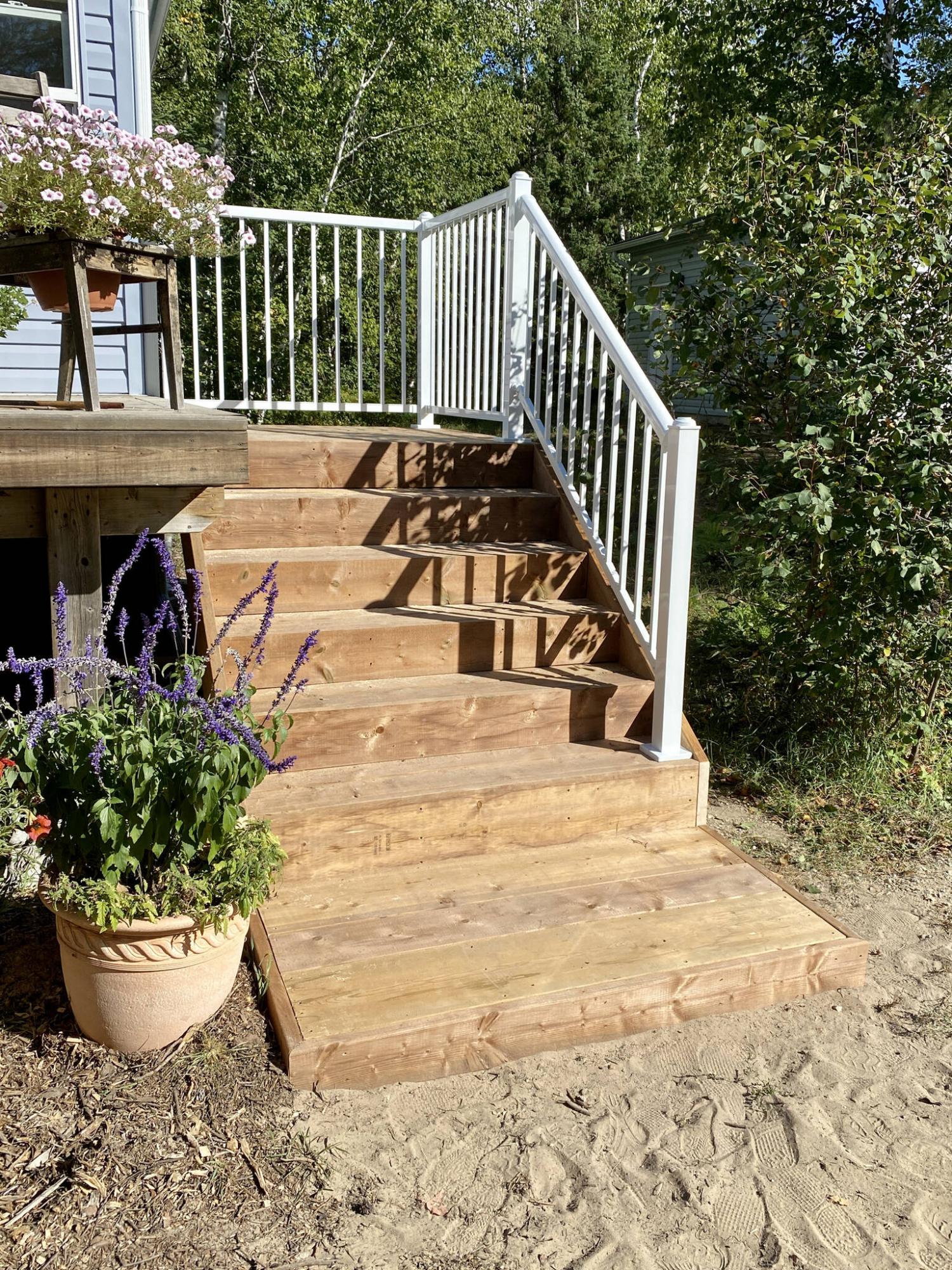 A short drive to the beaches was planned on a Saturday a few weeks ago, to erect a small five-foot by five-foot landing plus stairs adjacent to the near side of an existing deck. This location was familiar, having spent the better part of three months in 2018 on site adding a rather large addition to the far side of this four-season cottage. Until that Saturday, the homeowners had to walk past the front of the dwelling to reach the stairs on the far side of the front deck simply to access the cottage entrance. Before the addition, the front door was conveniently located to this far away staircase. Post-addition, with the main entry now situated on the close side, the cumbersome trek to reach the front door has become a nuisance. As such, a new staircase would be added to undermine the unpleasantness.