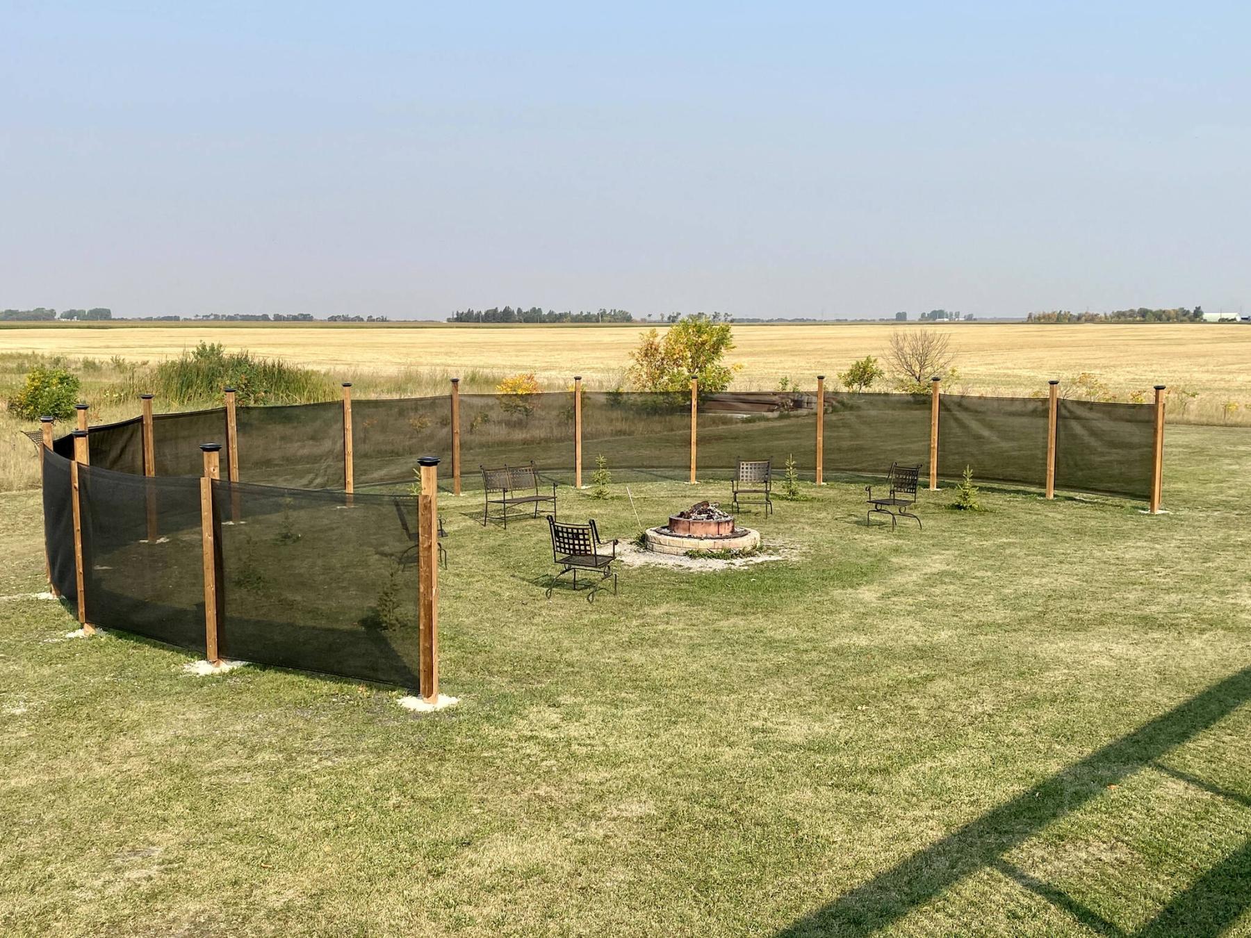 In recent years, an eight-foot high fence line has been established along strategic areas of the north and south boundaries which has for the most part, aided in controlling the volume of wind and the snow drifting that occurs during the winter months. The fence sections consist of 6×6 posts, with wind-mesh panels that lessen the wind speed by 70 per cent. Hence, the drifting rate is greatly lowered allowing a reasonable time-frame to tackle any ensuing drifting that occurs. It is even quite noticeable during the summer months, while walking in the yard along these fence sections — the wind is greatly reduced, and this got me thinking about the fire-pit area once again.