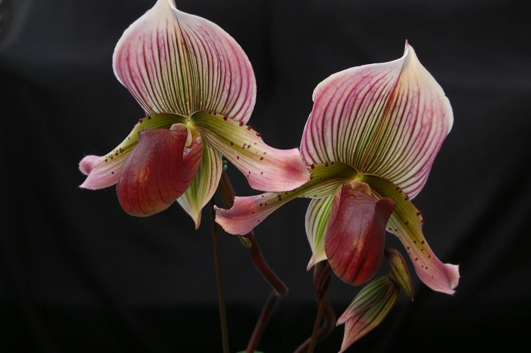 Phalaenopsis orchids require medium-intensity light and do well in an east- or west-facing window. This location is also ideal for slipper orchids, an impossibly beautiful orchid that is an Asian relative of our native lady slippers. The scientific name is Paphiopedilum, pronounced paff-ee-oh-PED-ih-lum. Porteous recently purchased a slipper orchid at Ever Spring Orchids, 2868 Pipeline Rd., West St. Paul. Ever Spring Orchids is the largest orchid greenhouse in Canada’s Midwest. Slipper orchids bloom annually and the flowers last for several weeks. They are available in a wide range of colours and while there are some varieties of slipper orchids that are more challenging to grow, there are also varieties such as the Maudiae type that are easy to grow. These are smaller plants and have dark green mottled foliage.