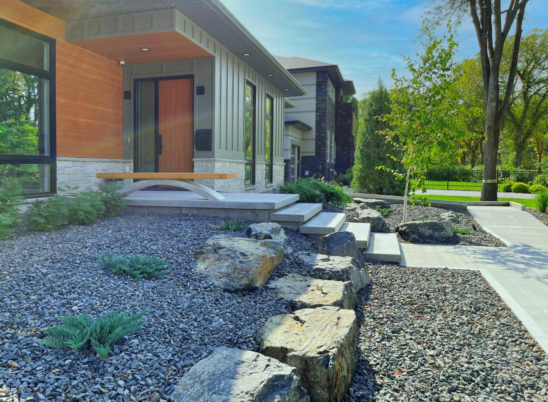 Proper grading and adaptive solutions such as the use of boulders are sustainable actions in this resilient landscape design.