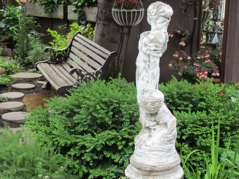 Accented by a unique cast-iron chair, one of the many iron accents throughout the garden, the work area is accessed by a winding pathway lined with a thick boxwood hedge planted in 1985. Typically, boxwood, an evergreen, can be subject to considerable winter browning. Consisting of three shrubs, Young’s boxwood hedge is in glowing health. Situated in an east exposure, the hedge receives morning sun and afternoon shade. Mounds of leaves at the base of the hedge together with an abundance of snow cover are all the protection afforded to the boxwood during the winter. Young ensures that the boxwood is well watered in the fall, key to ensuring that it goes into the winter with adequate moisture.