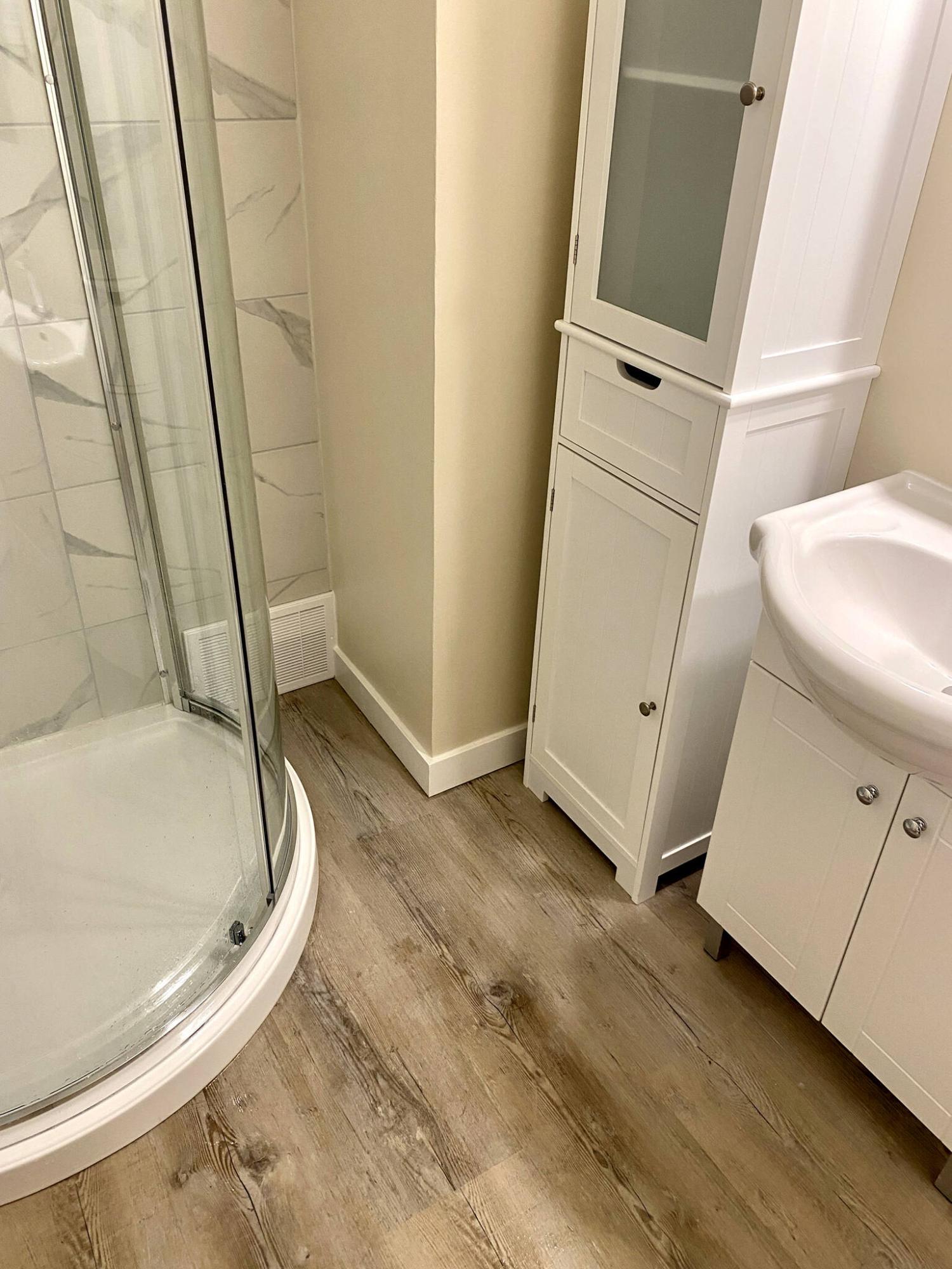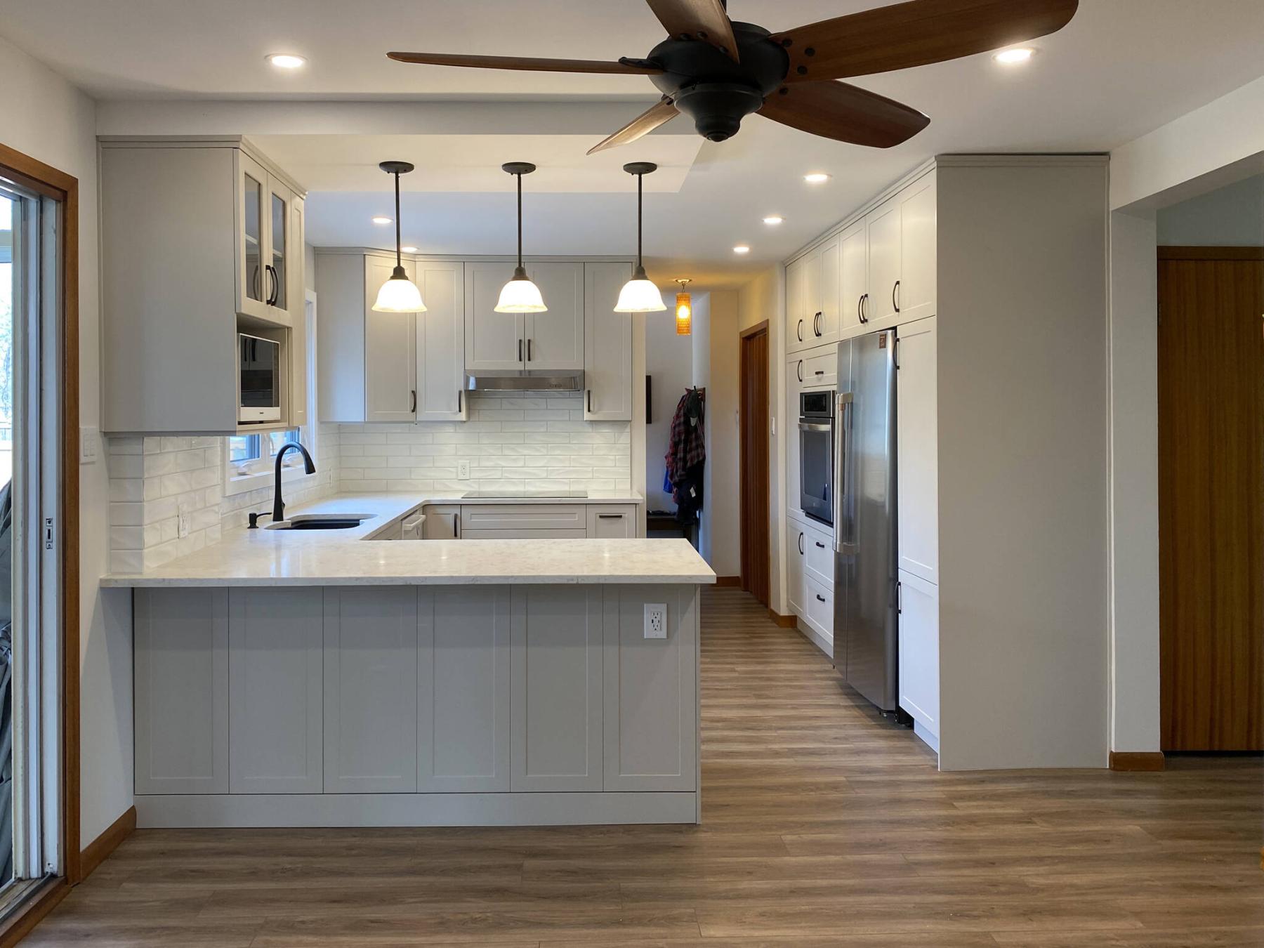 The walls painted a faint grey, with the cabinets slightly darker, complement the mid-grey wood-grain of the vinyl-plank flooring.