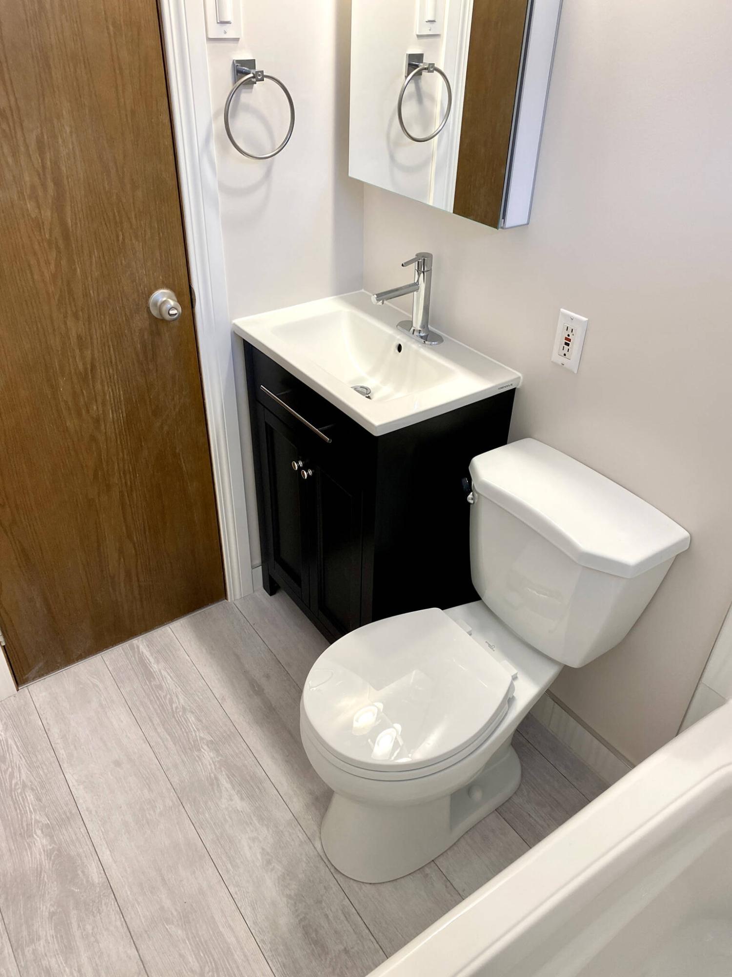 Light-grey flooring and wall paint allow the dark vanity to pop, visually.