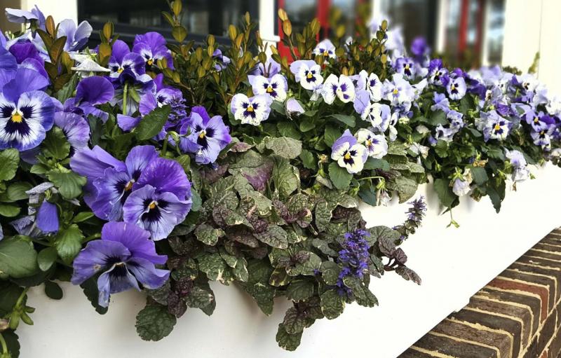 Burgundy Glow ajuga cascades over the edge of the container it grows in, making it a great inclusion in just about any mixed container. Here it is paired with Delta Marina pansies.