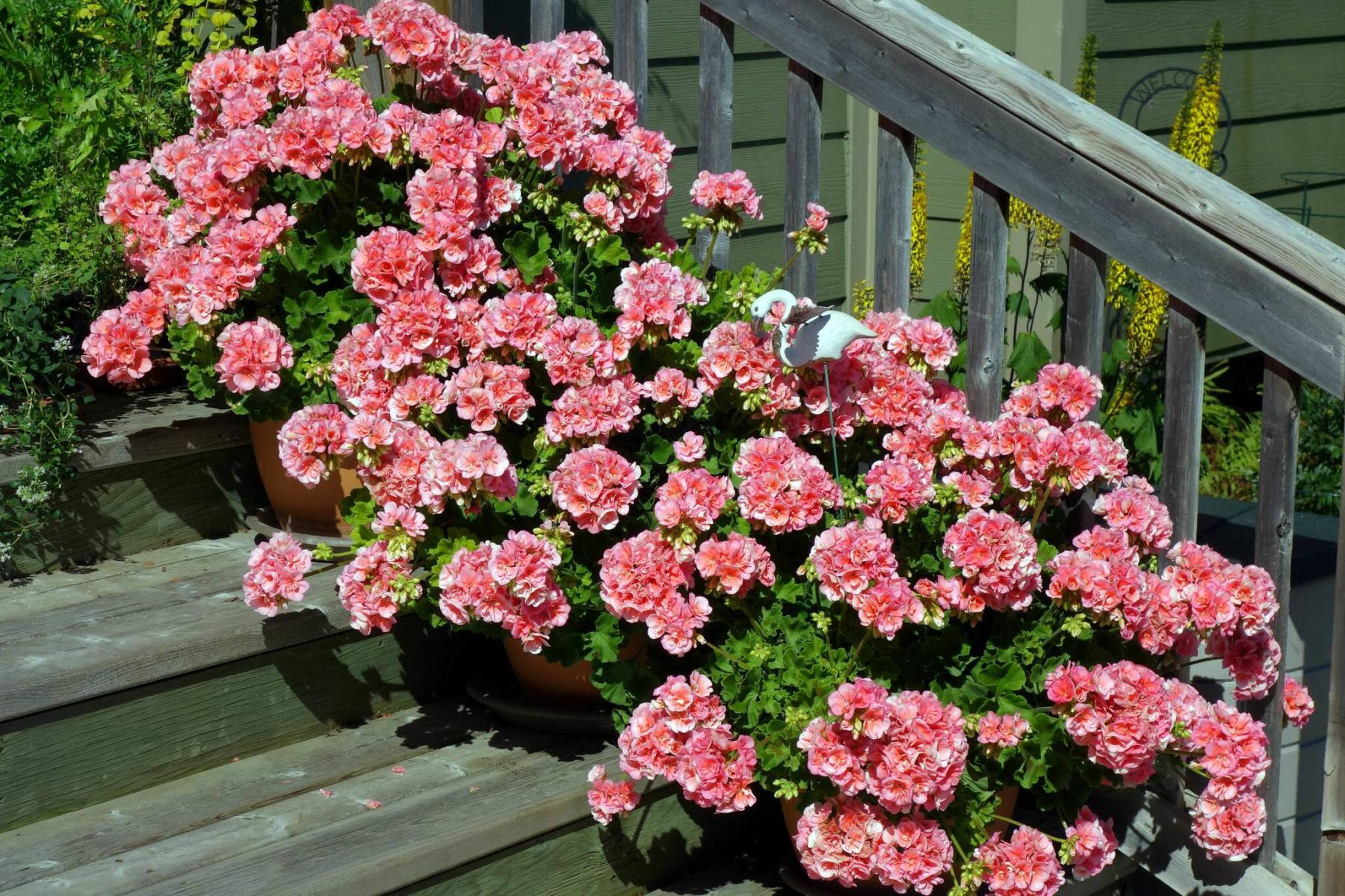 This has been an exceptional year for geraniums, says Geske. “The growing season started so early and extended well into September but also it was so hot that it worked for my geraniums and peppers which are both known to tolerate heat, but the heat didn’t work so well for some other types of plants,” says Geske. “My geraniums were so incredible that you couldn’t see the leaves. They were absolutely breathtaking.” Geske propagates geraniums from stem cuttings. Last fall when she brought her potted geraniums into her garage, she grew 223 new plants from cuttings. Some years she grows more than 400 cuttings. She grows the cuttings into larger plants over the winter and in spring she uses them to decorate her lakeside property. “I put two in a pot, sometimes three, and I also plant many geraniums in the ground.”