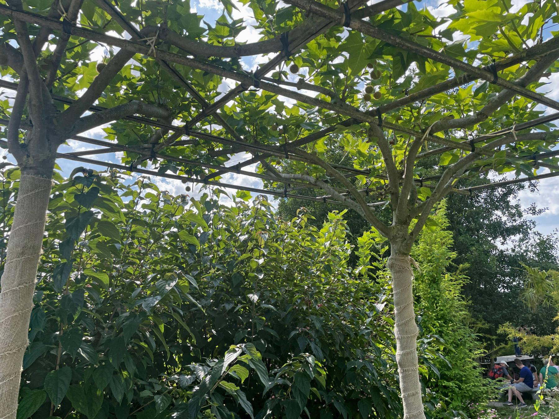 Cooling shade is provided by a simple, natural trellis of trained tree branches supported by metal rods.