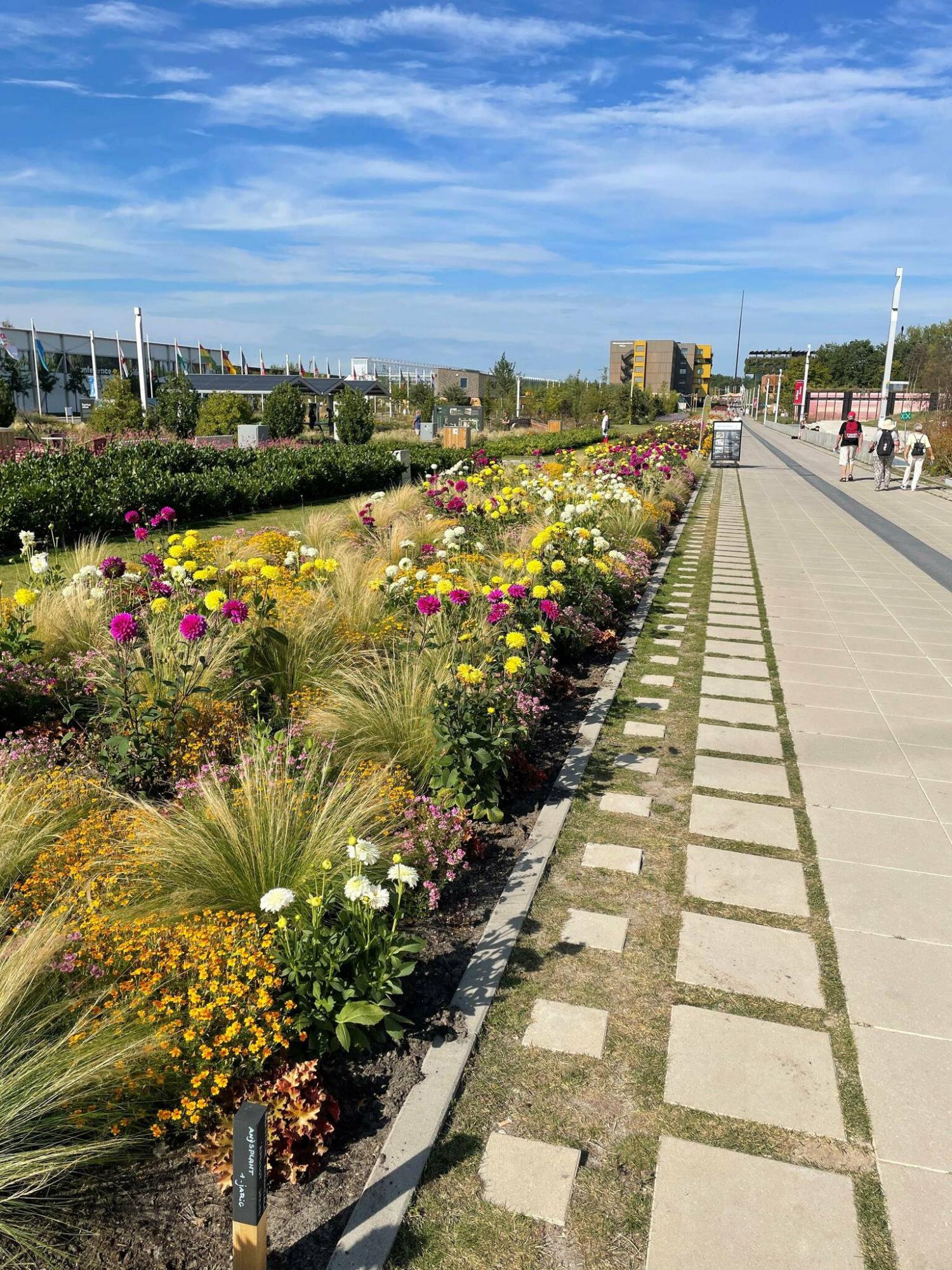 Almere, a new city district on the outskirts of the Netherlands, was selected as the 2022 expo site. The 148-acre site was planted with 650 different tree species in alphabetical order as well as more than 180,000 perennials and thousands of shrubs, annuals, and flower bulbs. A more than 3km long ribbon of pollinator-friendly plants showed groupings of plants that are attractive to bees, butterflies, and other pollinating insects. One example of a bee-friendly plant grouping that Helen admired at Floriade included Perovskia Russian Sage, Pennisetum Fountain Grass, Phlomis Jerusalem Sage, and Persicaria bistorta, all of which can be grown in our Zone 3-4 climate.