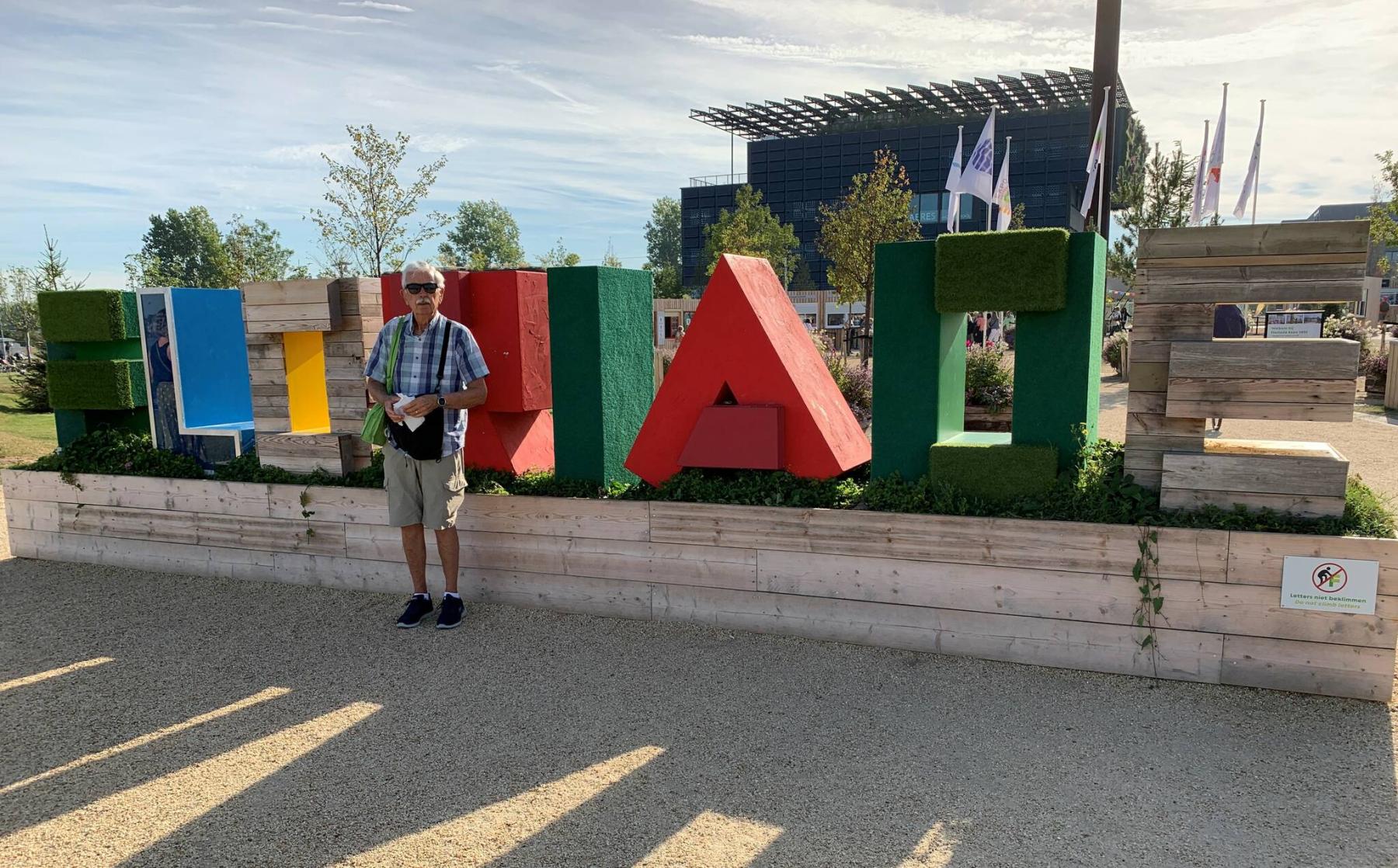 Victor Lesser at the entrance to Floriade Expo 2022. The Floriade sign was made from recycled materials.