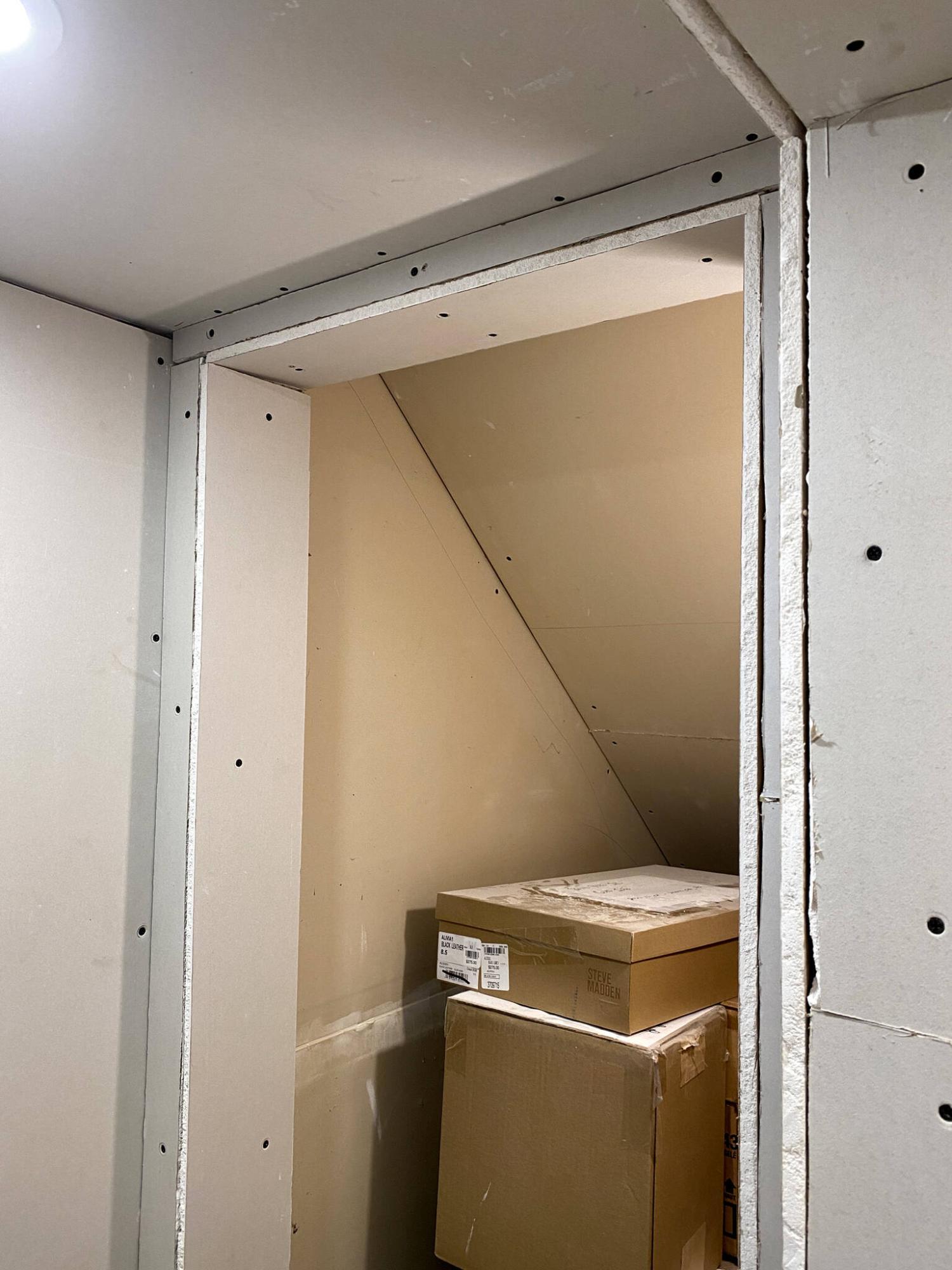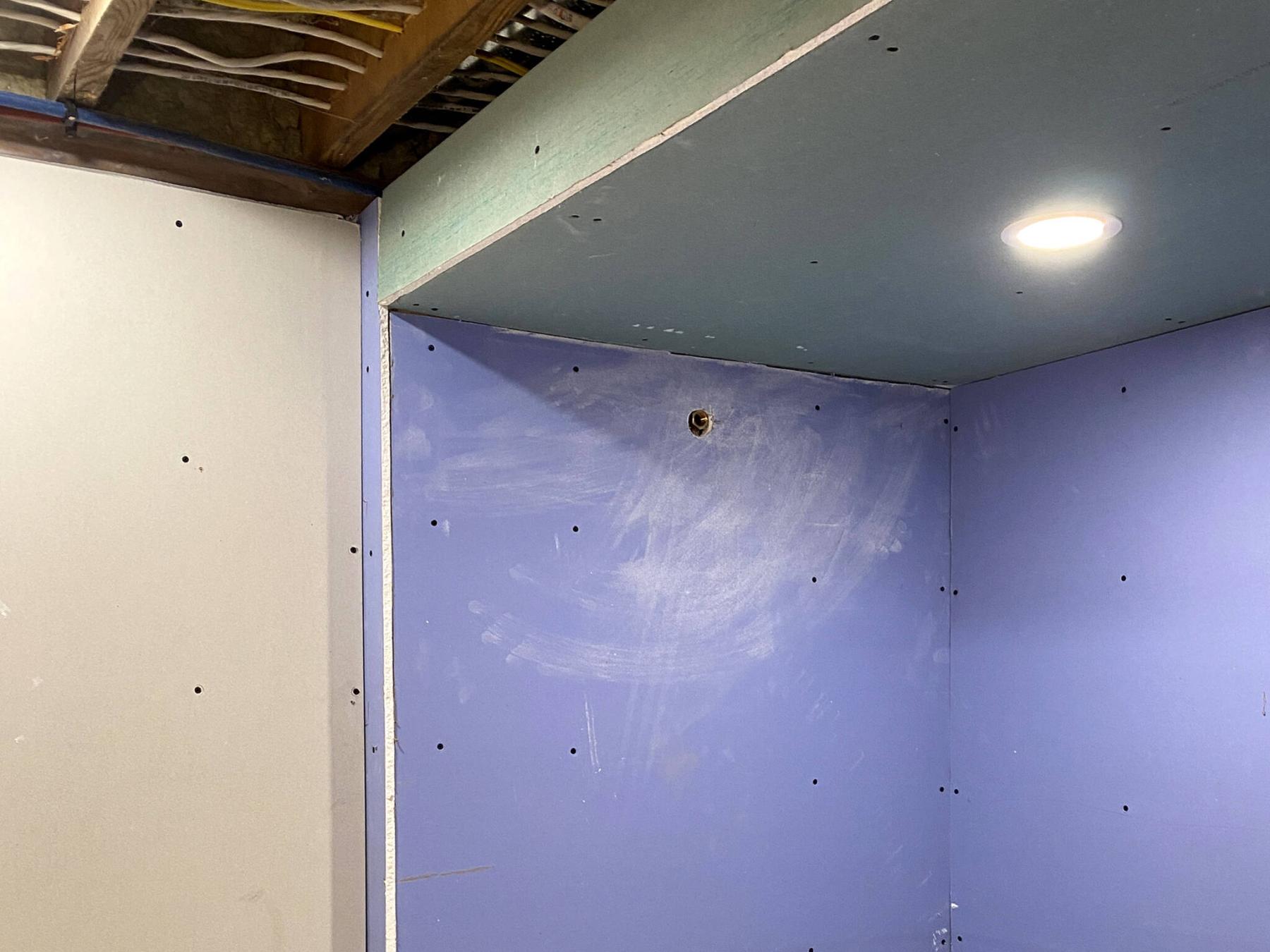 The staircase presented a challenge for negotiating full sheets of drywall downstairs.
