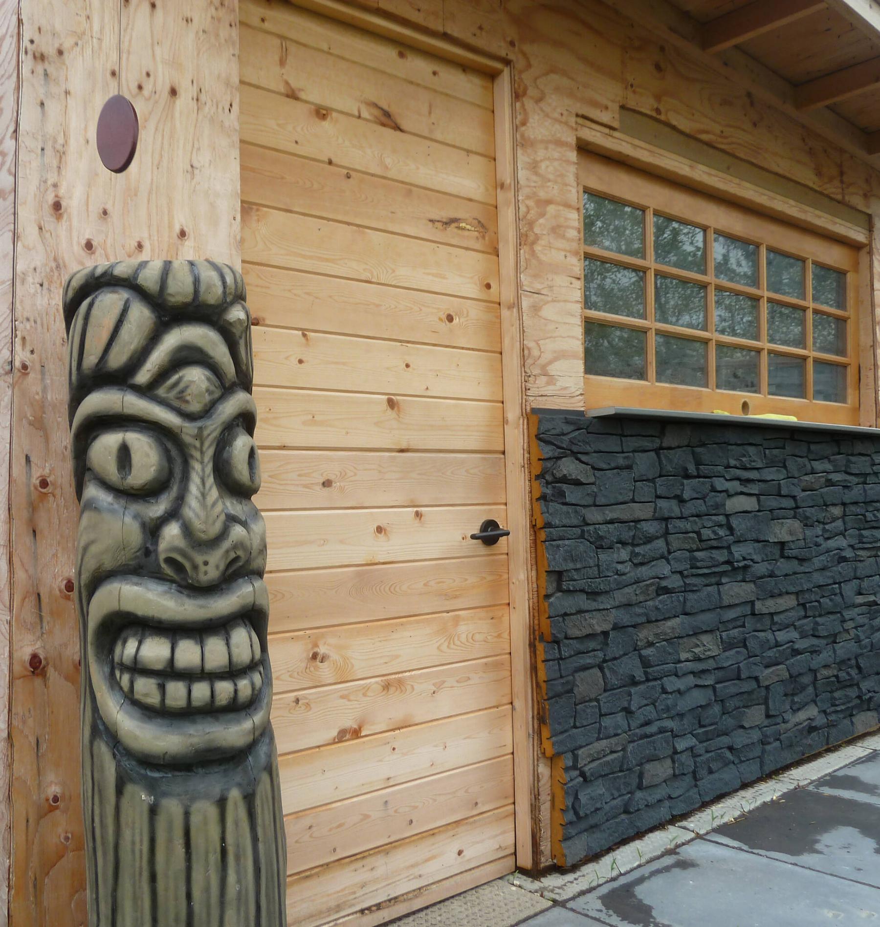 The tiki bar is nearing completion and features a Robert Unik carving out front.