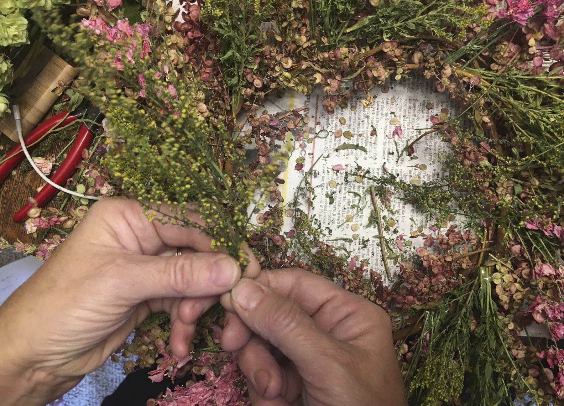 Terry Neufeld prepares to add Sweet Annie artemisia to a dried flower wreath.