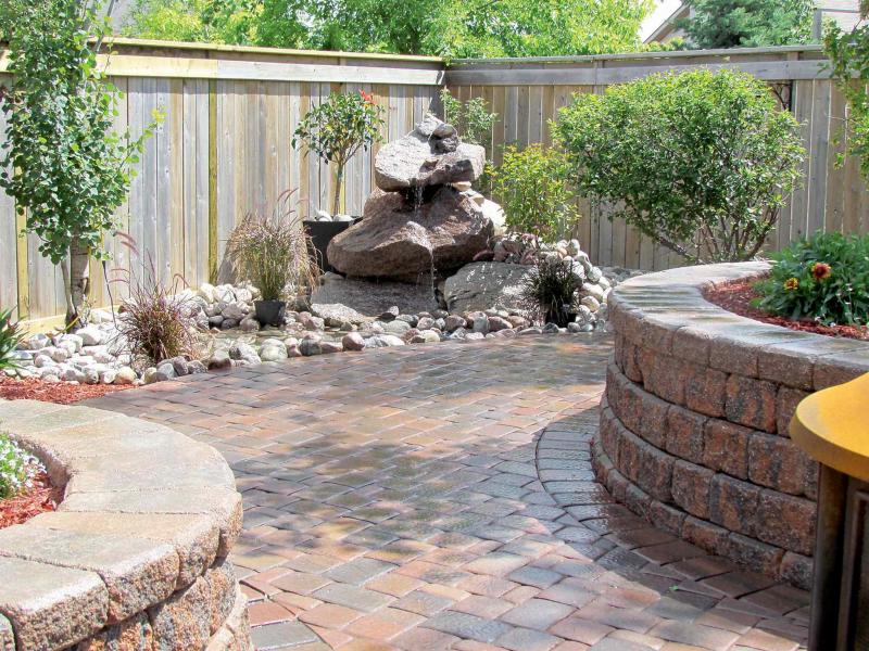 The Van Gils' average sized backyard measures 12 by 15 metres and yet appears significantly larger. Visitors are greeted by the sounds of trickling water. Planting beds are arranged along the perimeter of the property, framing an elegant terrace. Two large retaining walls in Roman Pisa Autumn Blend weathered stone, one teardrop shaped and the other kidney-shaped, are accented by imposing red granite boulders that have been incorporated into the front of the retaining walls.
