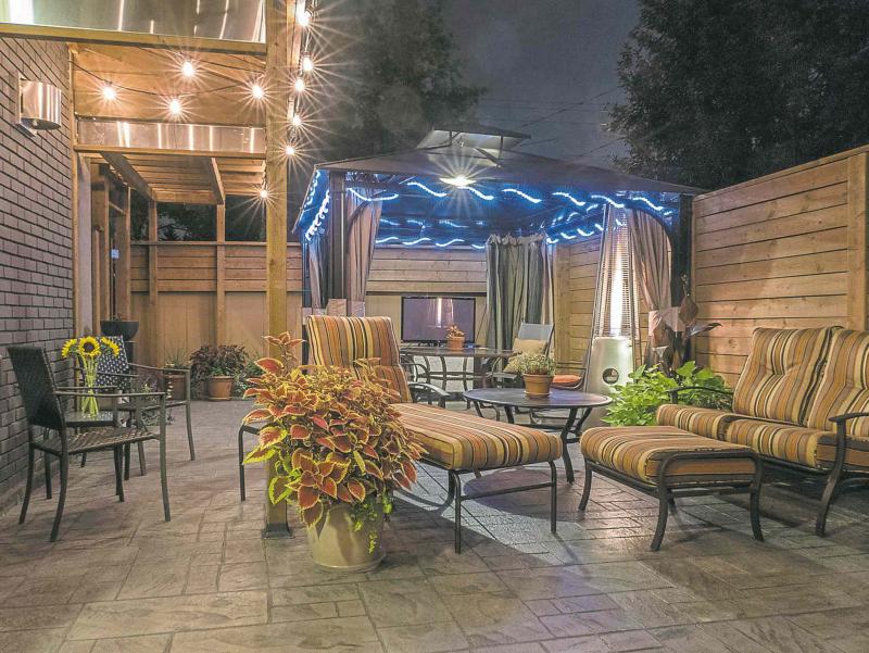 During the summer months, comfortable furnishings, including a flatscreen TV, make up the interior. The TV sits on a stand made from Tyndall stone that once served as a bench in front of their fireplace. While the gazebo affords the TV some protection from the elements, a durable outdoor cover made from acrylic-coated 100 per cent woven polyester fabric repels water and protects against mildew as well as dust and dirt which can cause a TV to overheat. Errol ordered the cover from tvcoverstore.com.