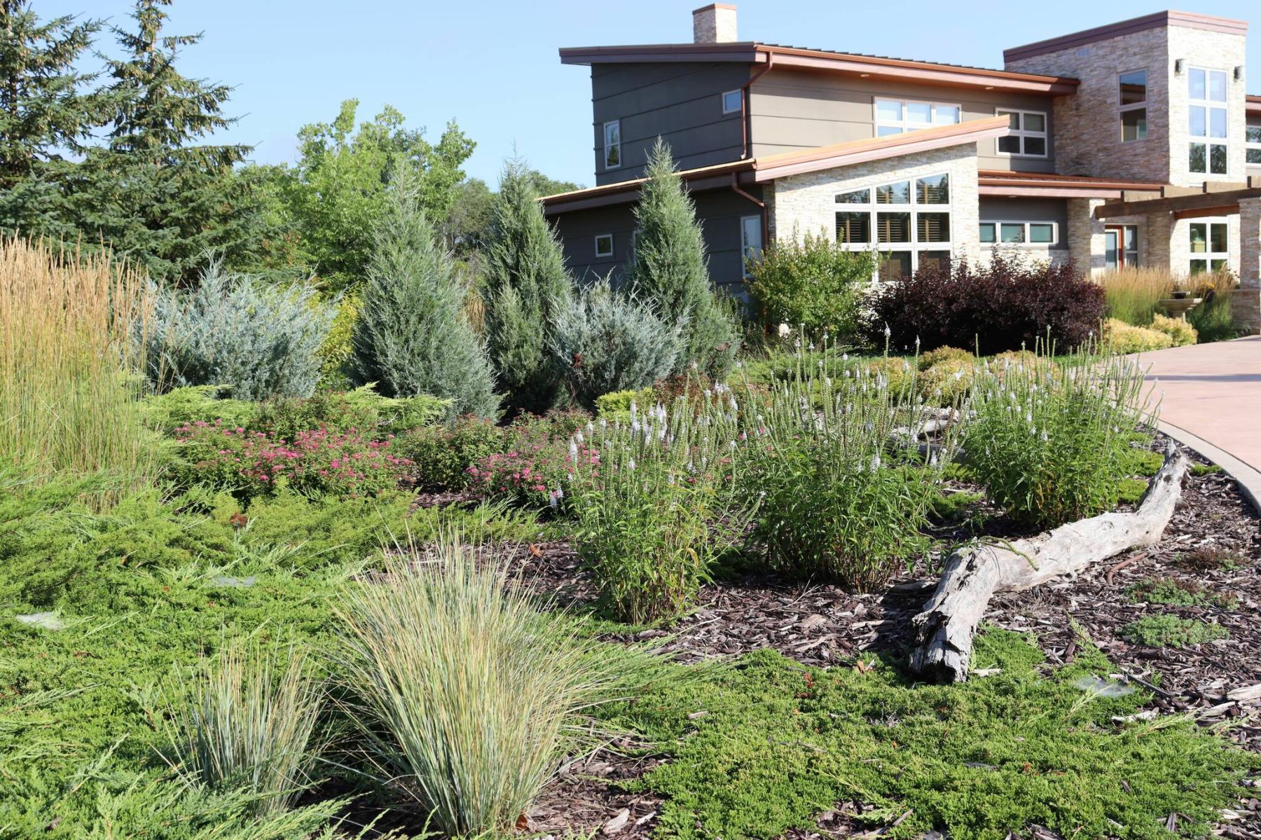 Spreading junipers and ornamental grasses bring shades of blues and greens to this landscape as well as deer resistance.