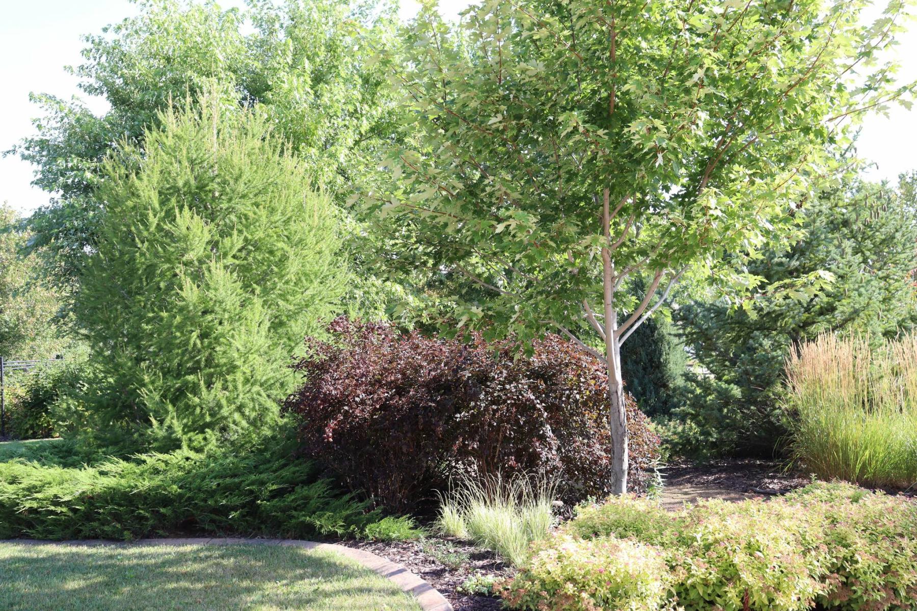 Tim and Jennifer’s property is characterized by a topography that is gently undulating in some areas, flat with curving paths in others, and then steeply sloped and shaded along the riverbank. There is such an incredible diversity of trees — birch, Amur maple, hackberry, Tecumseh plum, Northern Acclaim honey locust, ash, tamarack, spruce, willow, apple, to name just a few — along with shrubbery including ninebark, sumac, cotoneaster, honeysuckle,and the intriguing Pucker Up Red Twig dogwood.