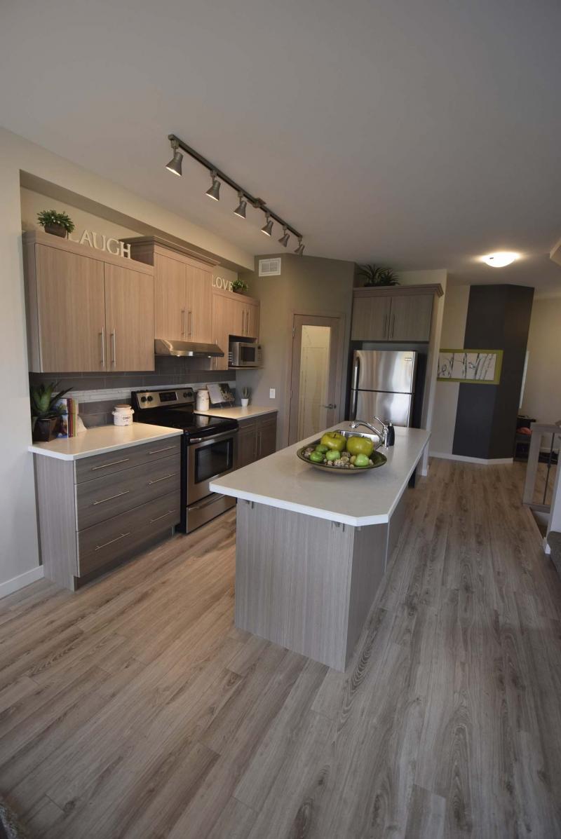 To the immediate right is a spacious kitchen that’s been outfitted with an eight-foot island with eating nook and double sink. Thanks to ample aisle width, there’s plenty of room to move. The finishes are impressive: smart (oak-style) vinyl plank flooring, a wealth of thermofoil cabinets, taupe/cream tile backsplash and light taupe laminate countertops.