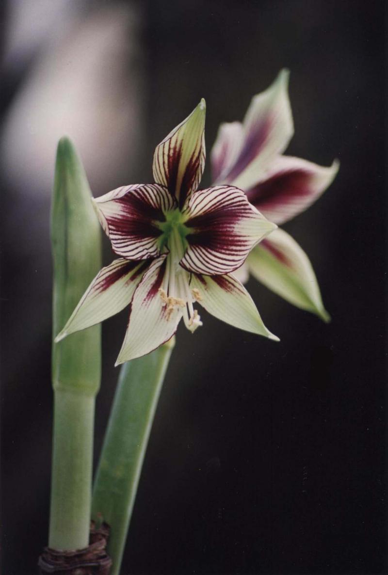 Orchid-like, dainty Papilio amaryllis has burgundy stripes on creamy petals.