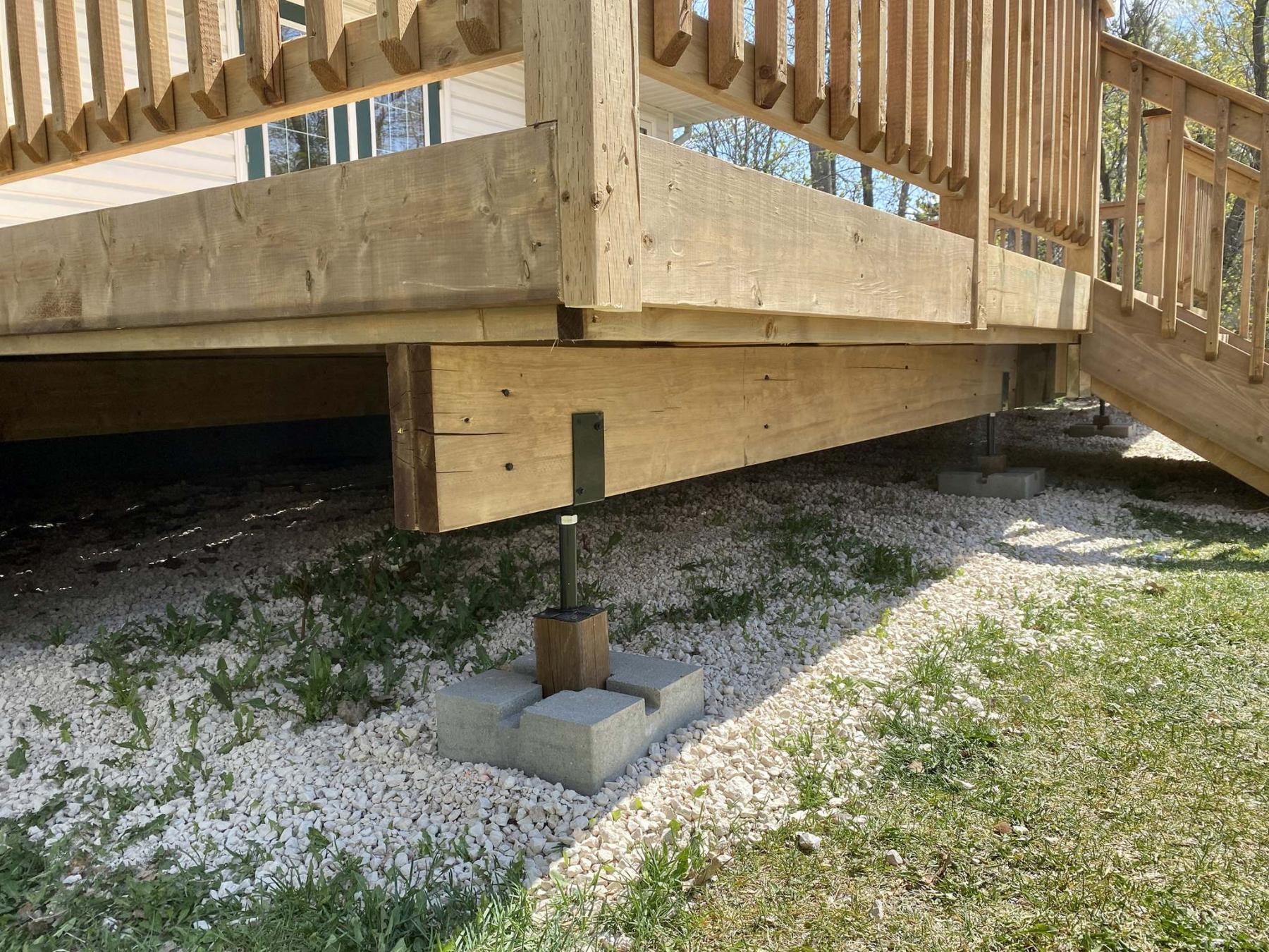 Joists sit atop laminated beams, that rest on posts and deck jacks placed on concrete post pads.