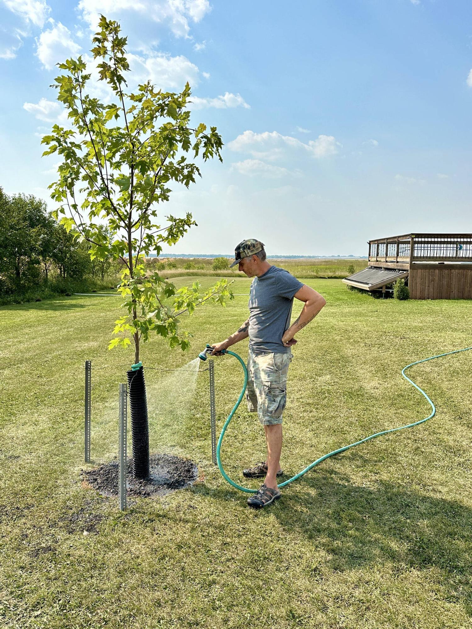 After the planting process is complete, the new maple tree receives a generous drink for the first time (and first of many) on the property.