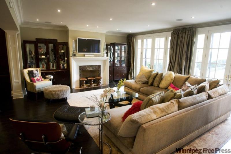 Midway down the landing to the basement, Mawby has designed a winsome powder room fit for a celebrity, complete with leather wallpaper, an 8x4-foot mirror set in a gold-leaf frame, chocolate-and-cream marble floors and a chandelier trimmed with strands of red crystals.
