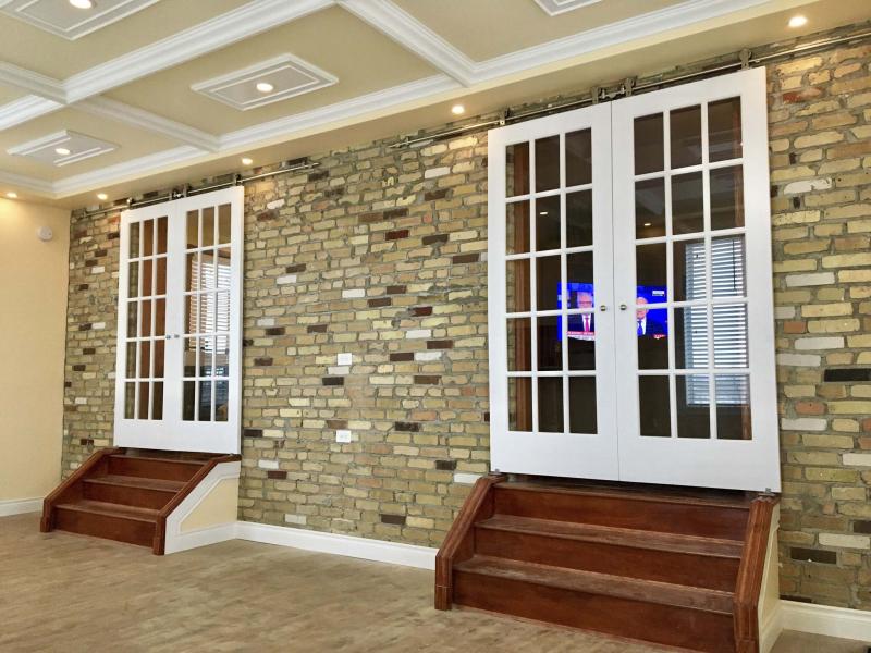 The tandem French doors open by sliding along a stainless-steel rod mechanism atop the entryway.
